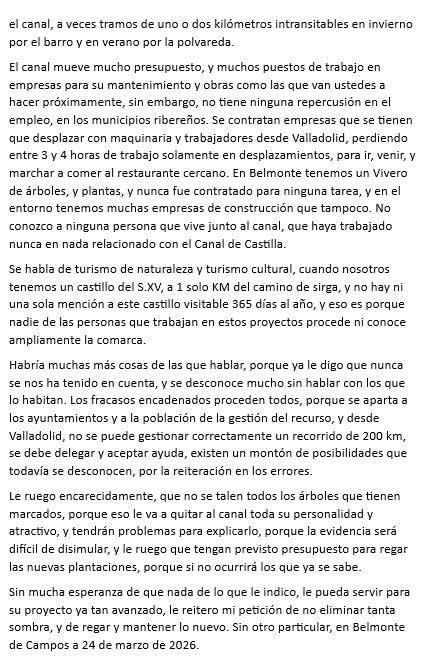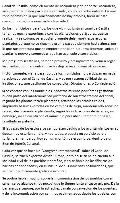 No está de más recodarles que los proyectos de esta envergadura como el que se está ejecutando sobre un entorno tan sumamente delicado como es el Canal de Castilla, declarado Bien de Interés Cultural (BIC) en 1991 en la categoría de «Conjunto Histórico» y que alberga decenas de humedales (incluido el propio Canal), integrados en la Red Natura 2000 catalogados como zonas ZEPAS, en una zona eminentemente esteparia, se deben desarrollar con suma mesura, a largo plazo y en las estaciones donde menor impacto ambiental cause tanto al paisaje como a sus hospedadores naturales que es la fauna silvestre, especies migratorias que como Ud. debería saber se encuentran catalogadas y emplean este ecosistema como lugar de refugio, alimento y reproducción. No utilicen el patrimonio de todos como si fuera su cortijo y tienda la mano para que los responsables de los municipios por los que atraviesa el Canal gestionen este bien nuestro de forma mancomunada. Podrán argumentar que estos hechos eran plenamente conocedores y según lo expuesto en el proyecto así fue valorado de forma positiva por el Ministerio de Transición Ecología del Gobierno de España logrando su autorización, pero Sres. una cosa es que el papel lo soporta todo, pero la realidad es bien distinta y muy poco, por no decir casi nada, concuerda, puede que por la inadecuada o ausencia total de una supervisión técnica de los trabajos que se estaban ejecutando, con la realidad que nos hemos encontrado.