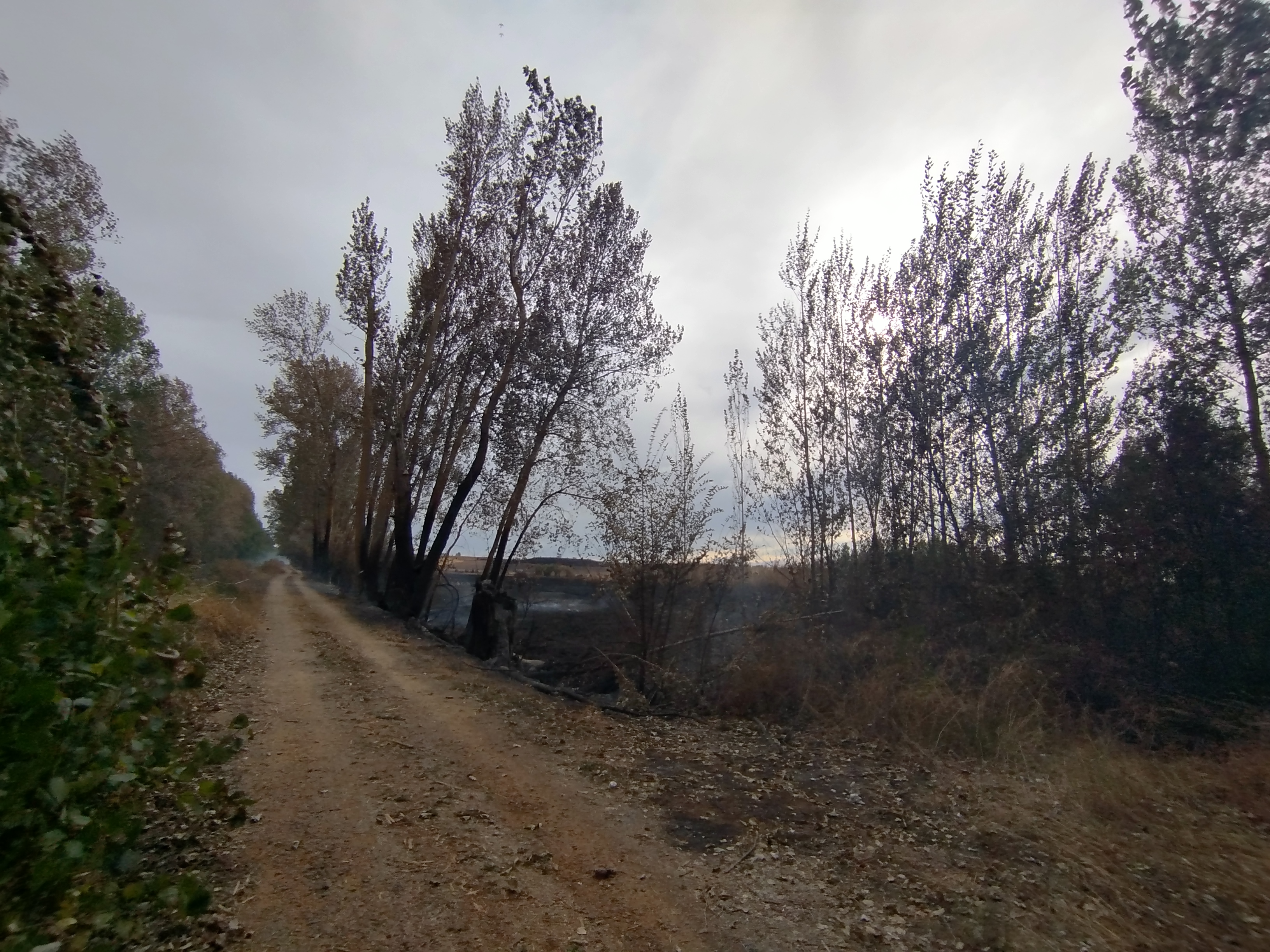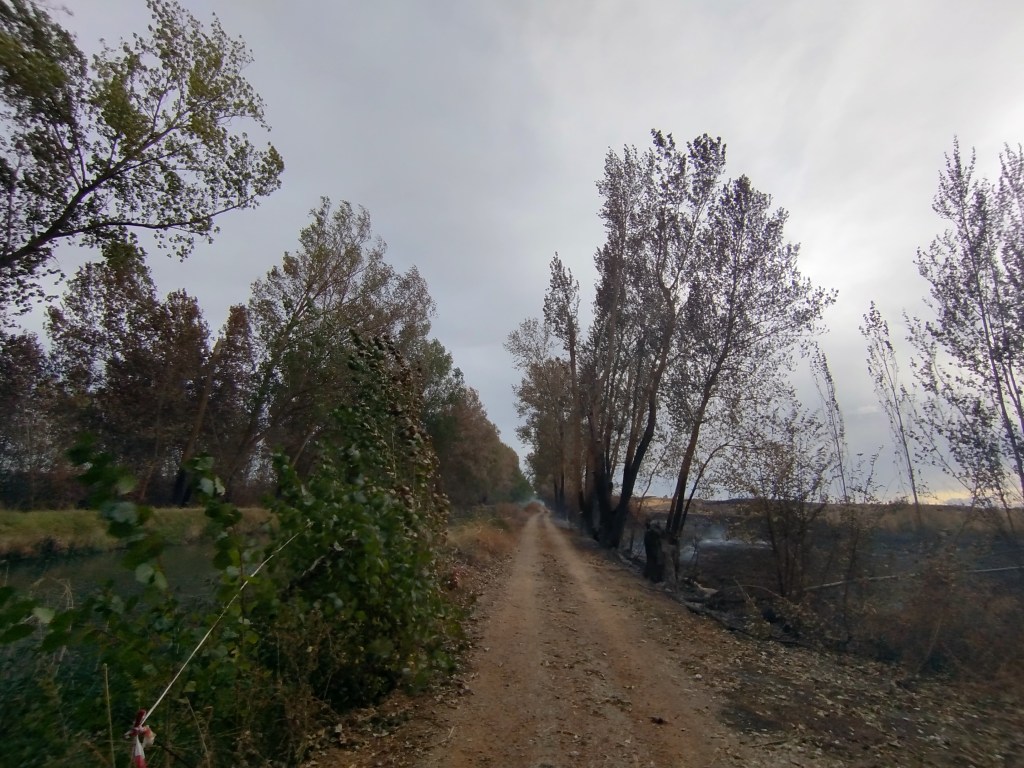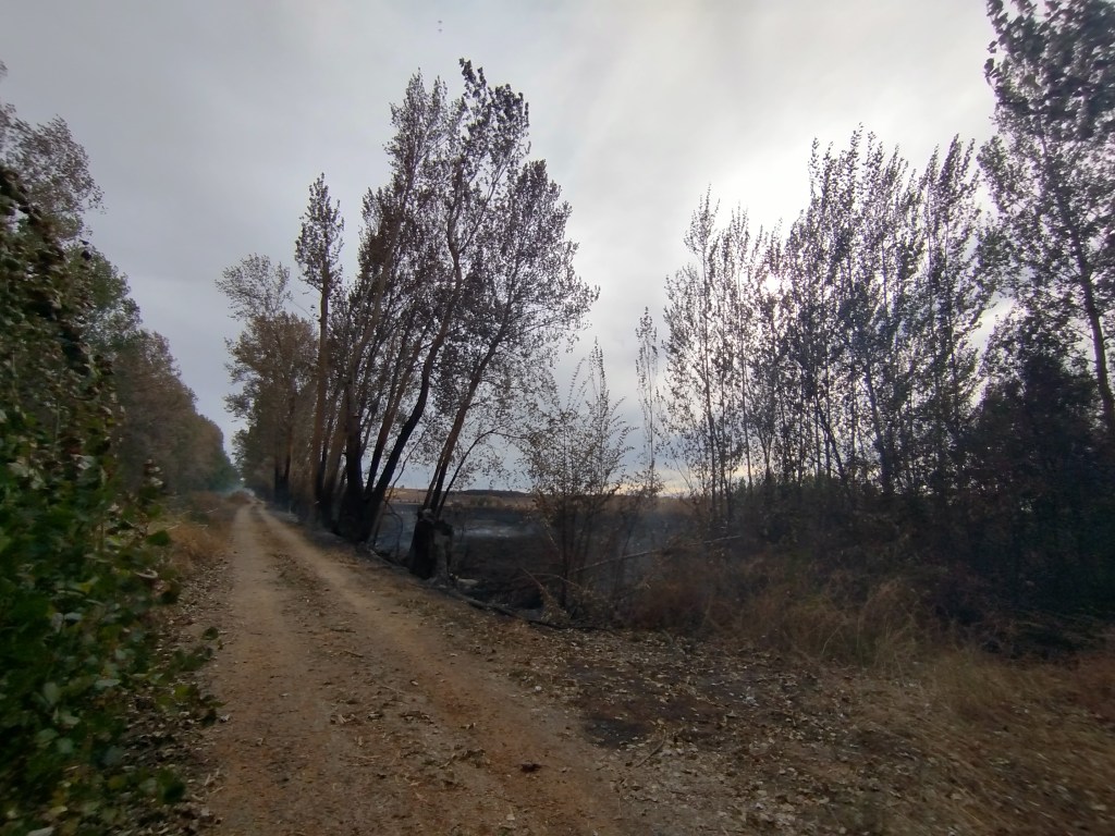 A finales del verano de 2025, concretamente el 25 de agosto, ante la omisión del deber de cumplimiento de detener cualquier actividad agrícola debido a las condiciones extremas de sequedad ambiental y elevadas temperaturas que se estaba dando, se produce un incendio en una parcela agrícola en la margen izquierda de la carretera CL-615 que une Palencia con Guardo, entre la Venta de Valdemudo y Perales. Por la intensidad del viento y la tardanza de la actuación de los bomberos por la distancia a recorrer desde Palencia, por falta de otras dotaciones más cercanas, el incendio rápidamente se propaga y salta susodicha carretera a la margen derecha de la misma afectando de lleno a otros terrenos agrícolas y forestales, así como a la propia charca o Laguna de Valdemudo y parte del Canal de Castilla al cual está anexa. El resultado es la practica totalidad de vegetación arbórea, arbustiva y herbácea calcinada, animales muertos, no solo por los efectos directos de las elevadas temperaturas alcanzadas en tan breve espacio de tiempo sino por la intoxicación ambiental, tanto en calidad del aire y agua, al que se vieron expuestas estas especies, tanto es así que debido a la cantidad de materia orgánica que subyace en el subsuelo a modo de turba bajo el manto vegetal, estuvo ardiendo de forma soterrada durante varias semanas después. Esto nos enteramos unos días después, concretamente el 3 de septiembre de 2025, cuando nos dispusimos a realizar una de nuestras habituales rutas por el Canal de Castilla y nos dirigimos hacia este lugar, iniciando el recorrido de Calahorra de Ribas, junto a las triples esclusas del Canal que ponen punto final al Ramal del Norte y donde oficialmente tuvo lugar en 1753 de forma simbólica el inicio de las obras del Canal. Teníamos pensado hacer una ruta circular y dirigirnos hacia el sur, desde ese mismo lugar hasta el Puente de Valdemudo y volver, desgraciadamente no pudimos completar el recorrido por los hechos descritos anteriormente.