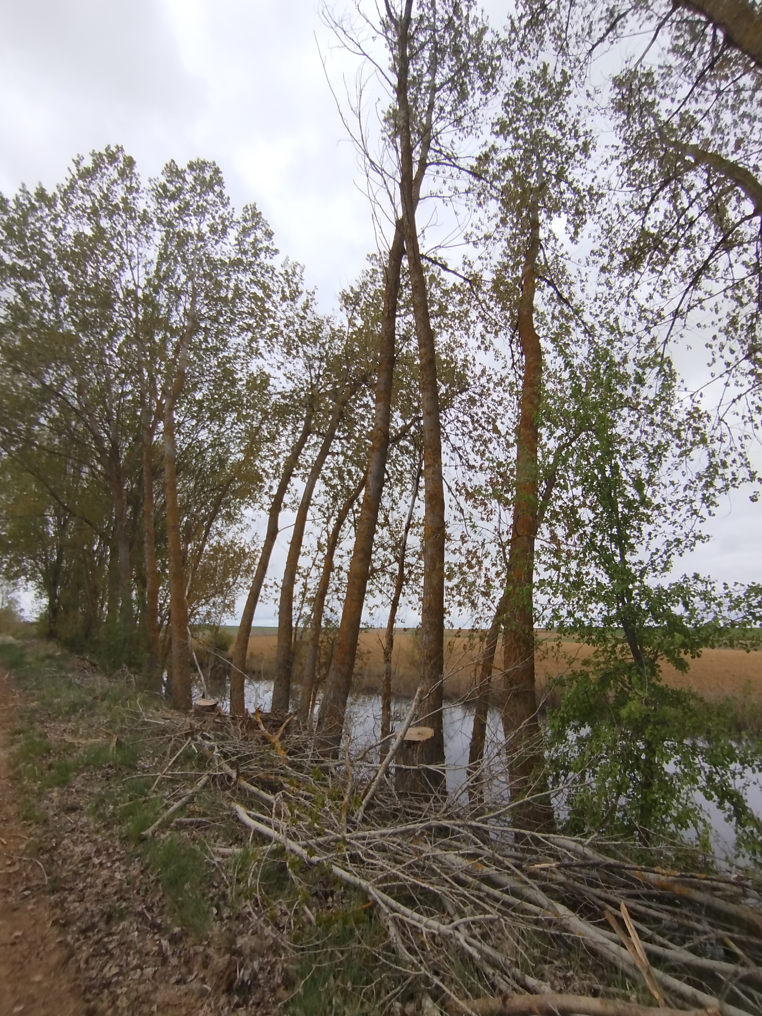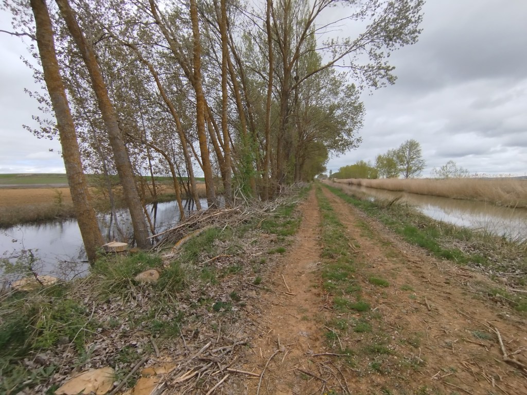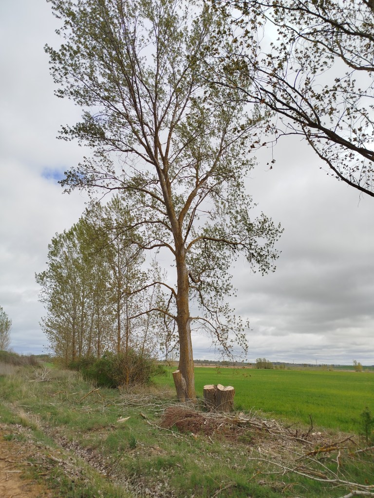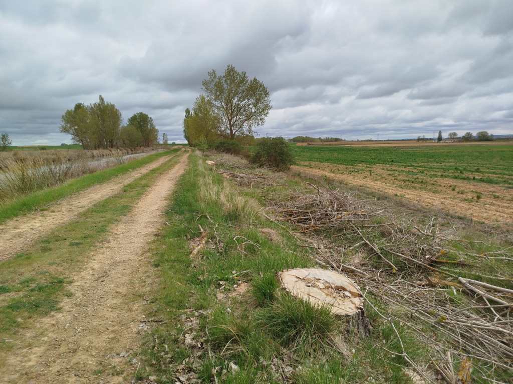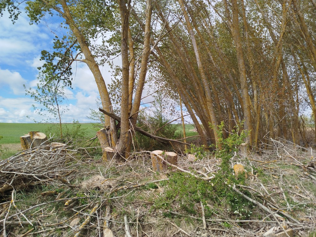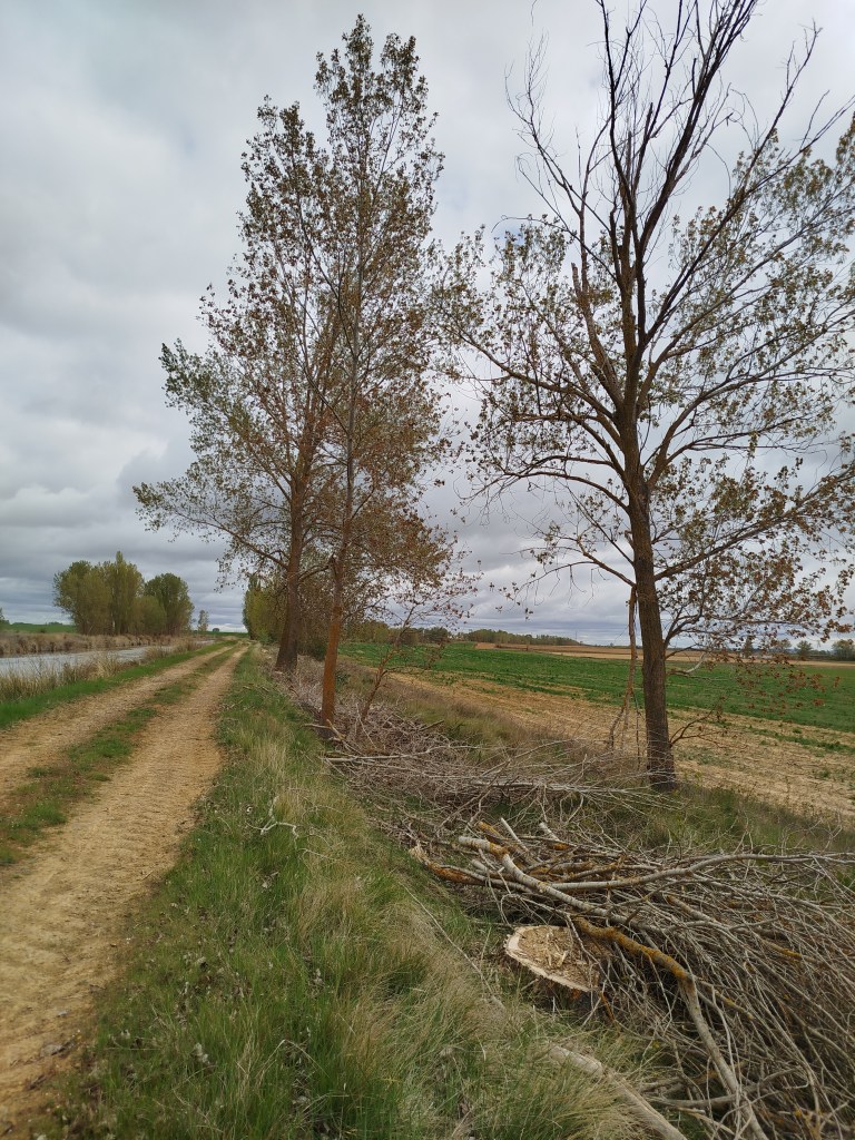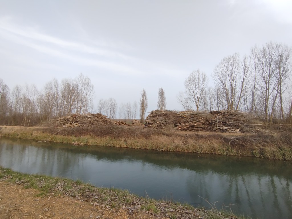 Tampoco pudimos hacer el recorrido completo cuando regresamos el pasado 5 de marzo de 2026, pues pensamos que tras el tiempo transcurrido y las regulares precipitaciones que tuvieron lugar desde mediados del invierno, aquello se habría recuperado en parte, sin embargo lo que iba ser uno de nuestros maravillosos paseos, rodeados del feliz bullicio de los pájaros los cuales empezaban con el fervor ajetreo de una primavera adelantada buscando alimento, iniciando su cortejo nupcial y el despuntar de las yemas de los árboles mostrando en el caso de los chopos, álamos temblones, sauces, olmos, etc. nos encontramos con un paraje desolador, ya desde el inicio del Ramal de Campos, en el punto donde el Canal toma las aguas del río Carrión, en los primeros 500 m antes de alcanzar el Ladrón de Calahorras, en su margen derecha aparecen a ambos lados de la parva o camino de sirga varios ejemplares sobradamente conocidos por nosotros, de espectacular belleza y totalmente sanos fueron cortados desde su base, ejemplares de grandes dimensiones y que por sus anillos cuantificamos edades de entre 30-50-80 años, o sea ejemplares que aún estando en su madurez (que no significa senectud), no se encontraban ni deformados ni manifestaban signos evidentes de estar enfermos como suele ser que aparezcan hongos parásitos en la base de su tronco o a lo largo del mismo.