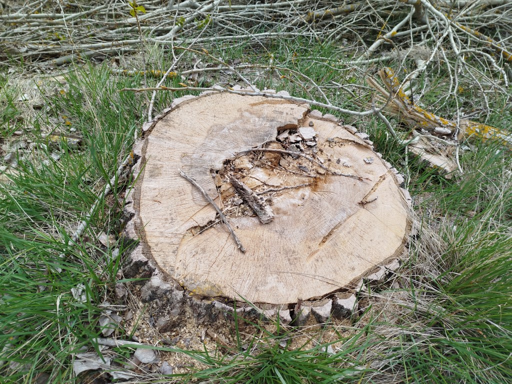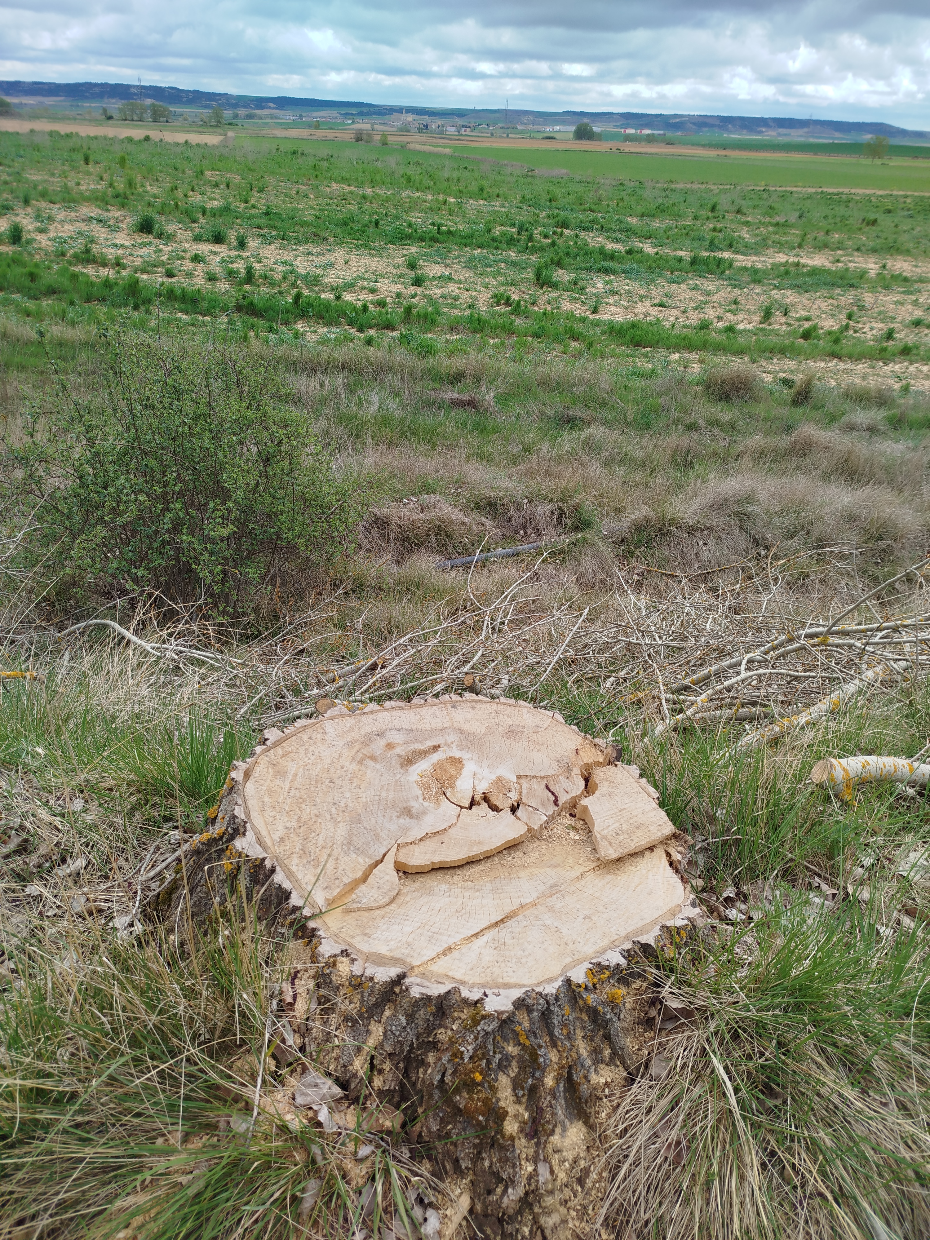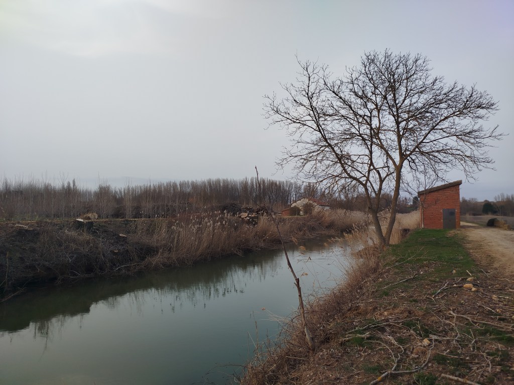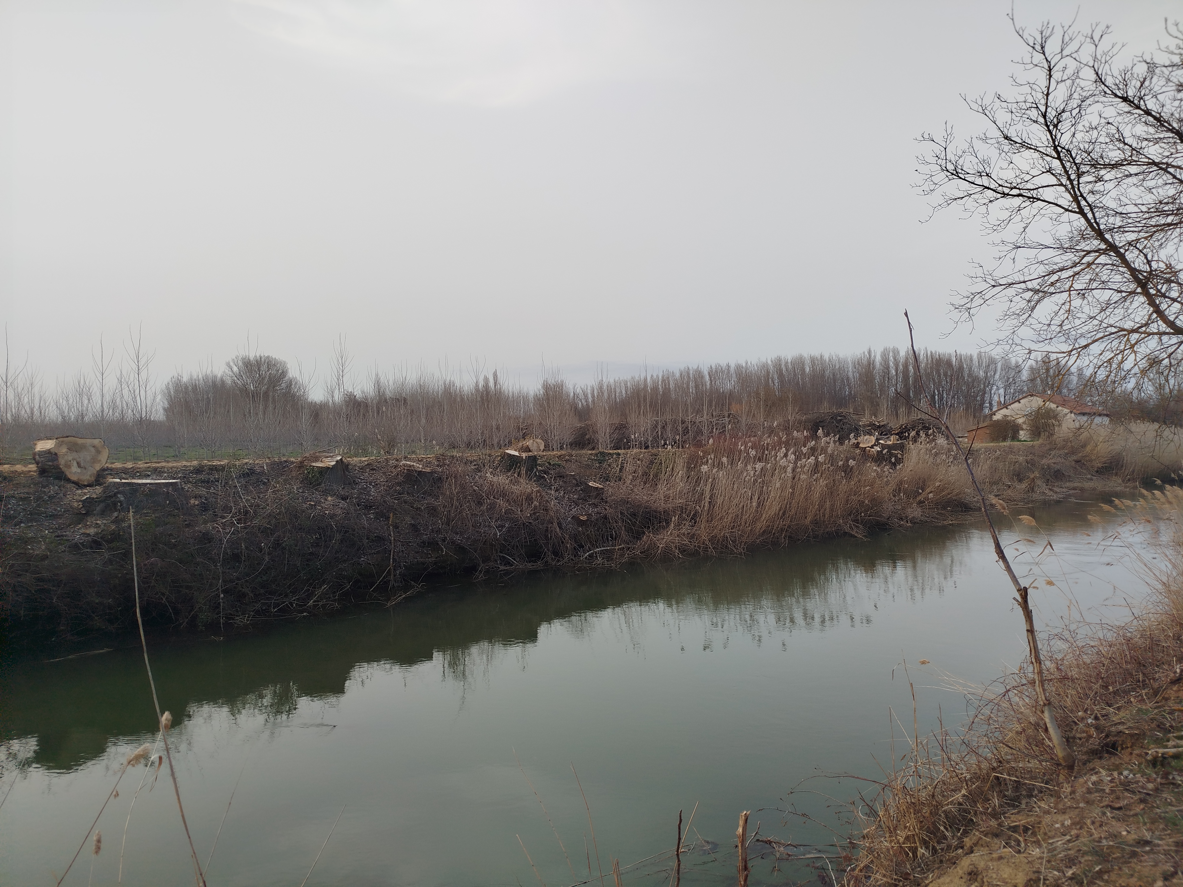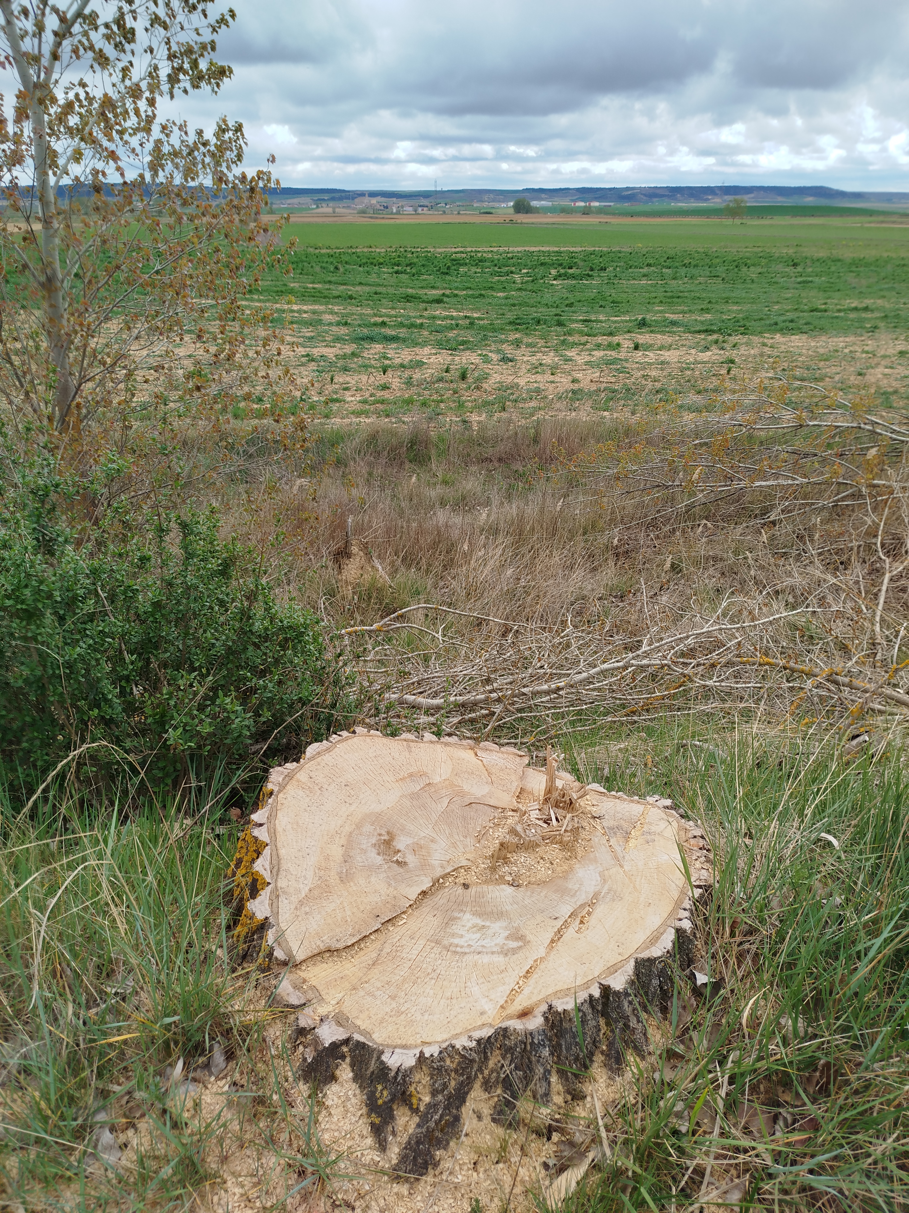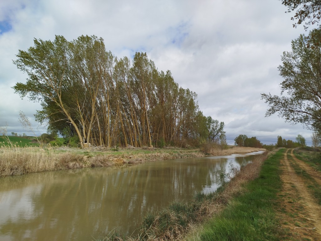 Tampoco pudimos hacer el recorrido completo cuando regresamos el pasado 5 de marzo de 2026, pues pensamos que tras el tiempo transcurrido y las regulares precipitaciones que tuvieron lugar desde mediados del invierno, aquello se habría recuperado en parte, sin embargo lo que iba ser uno de nuestros maravillosos paseos, rodeados del feliz bullicio de los pájaros los cuales empezaban con el fervor ajetreo de una primavera adelantada buscando alimento, iniciando su cortejo nupcial y el despuntar de las yemas de los árboles mostrando en el caso de los chopos, álamos temblones, sauces, olmos, etc. nos encontramos con un paraje desolador, ya desde el inicio del Ramal de Campos, en el punto donde el Canal toma las aguas del río Carrión, en los primeros 500 m antes de alcanzar el Ladrón de Calahorras, en su margen derecha aparecen a ambos lados de la parva o camino de sirga varios ejemplares sobradamente conocidos por nosotros, de espectacular belleza y totalmente sanos fueron cortados desde su base, ejemplares de grandes dimensiones y que por sus anillos cuantificamos edades de entre 30-50-80 años, o sea ejemplares que aún estando en su madurez (que no significa senectud), no se encontraban ni deformados ni manifestaban signos evidentes de estar enfermos como suele ser que aparezcan hongos parásitos en la base de su tronco o a lo largo del mismo.