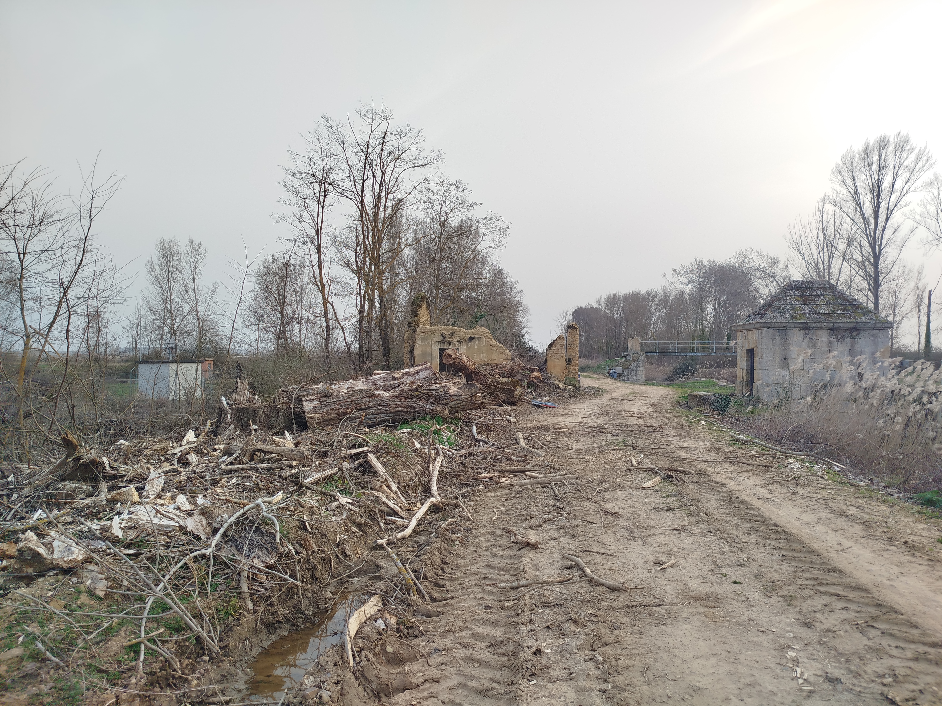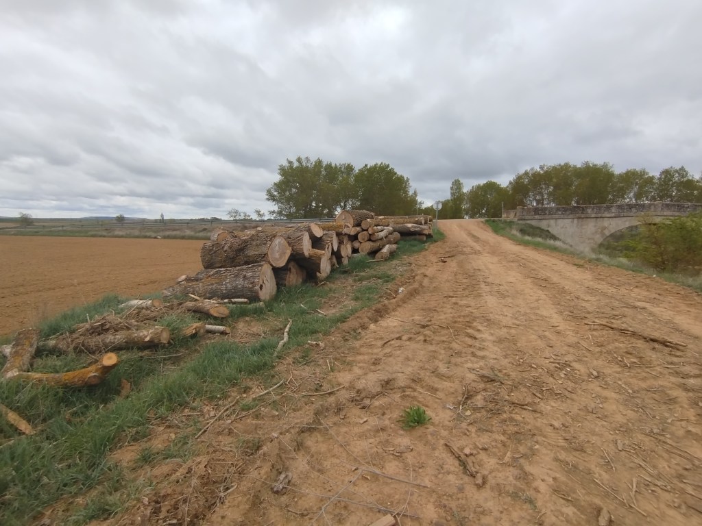Dimos la vuelta sobre el Puente de Valdemudo, para iniciar el camino de regreso hacia Calahorra de Ribas por la margen izquierda del canal y documentar lo que ya apreciamos ya desde la otra orilla, no sin antes recorrer unos metros aún más por el Canal hacia el sur, en dirección hacia el paraje de El Serrón en Grijota, pasando por debajo de la carretera CL-615 (aprovechando que la Diputación de Palencia había instalado un nuevo paso inferior, recuperando de esta manera la continuidad de las parvas o caminos de sirga, como así ha hecho este último año sobre el Puente de las Arcas en Palencia, o el Puente Viejo de Fuentes de Nava, etc.), con la intención de comprobar (sin conocer aún el proyecto que se estaba ejecutando), si esta deforestación continuaba o no. Muy a nuestro pesar, comprobamos que estas tareas se estaban realizando allí también, al otro lado de la carretera, nuevas pilas de troncos se estaban acumulando en terrenos de la margen derecha del Canal, y las cortas seguían realizándose e buen ritmo. Era evidente pues que esto no se iba a detener solo así. Nos sentíamos tan decepcionados de la ejecución de la mala praxis con la que se estaba ejecutando estos trabajos que lo empezamos a ponerlo en conocimiento público, pues muchísima gente es ajena a estas operaciones que los gestores públicos en este caso la CHD acuerdan realizar sin ni siquiera difundirlo a través de los medios de comunicación audiovisuales, obviamente por lo que todos sabemos que consecuencias sociopolíticas conlleva su difusión.