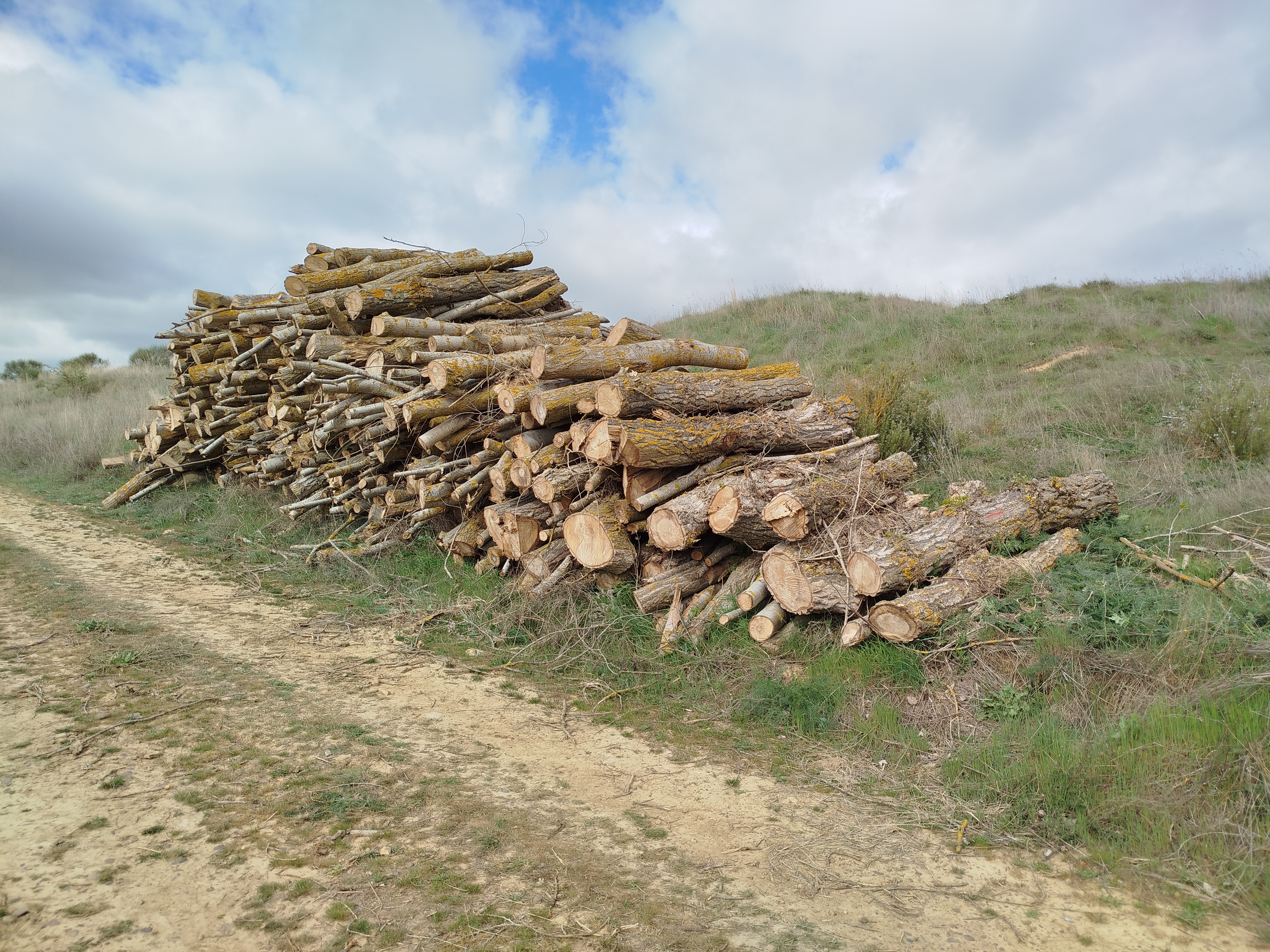 Alcanzamos las proximidades del Puente de Valdemudo, junto a la carretera CL-615 y la Venta de Valdemudo, allí se había instalado el «campamento base», por un lado aparecía la maquinaria de la empresa, por otro nuevas pilas de troncos y por otro un enorme cúmulo de virutas de madera, fruto del troceado de las pequeñas ramas.