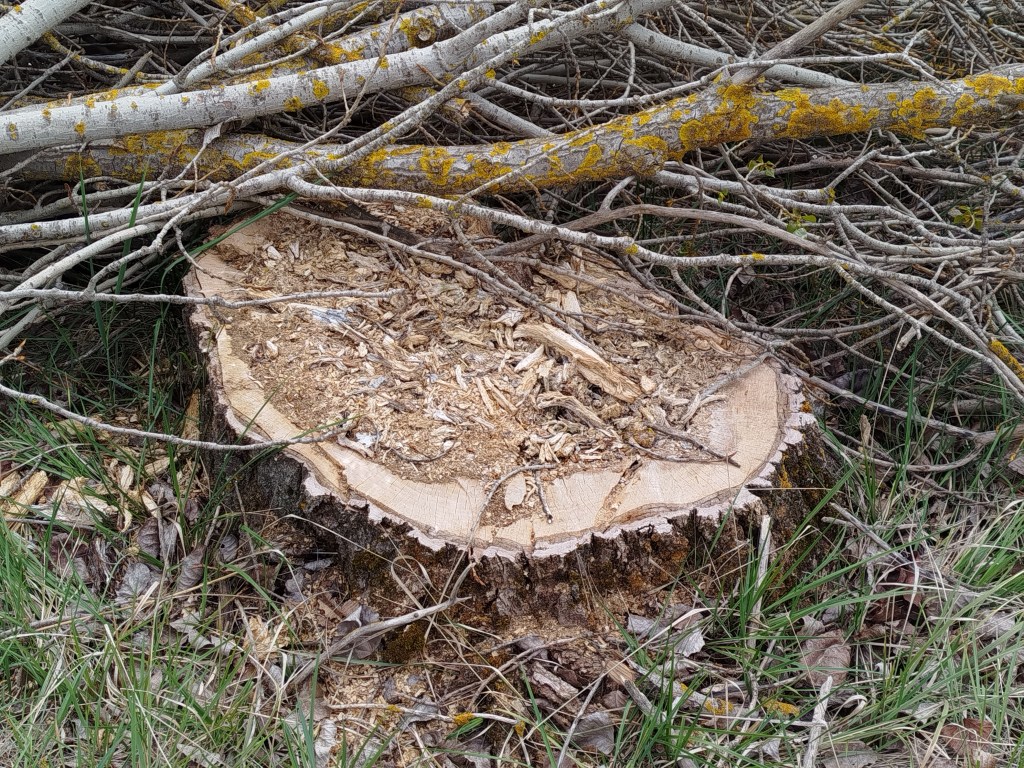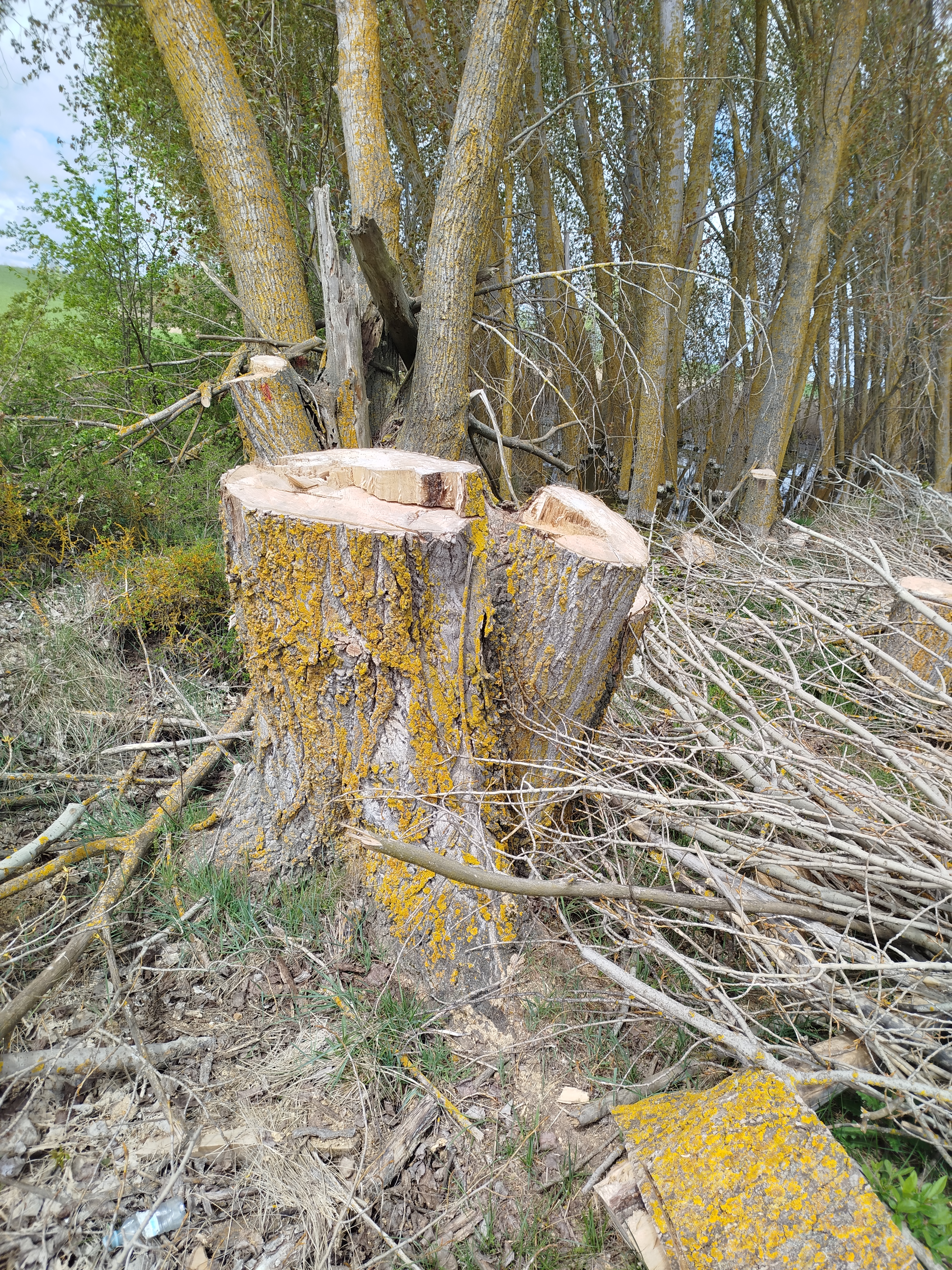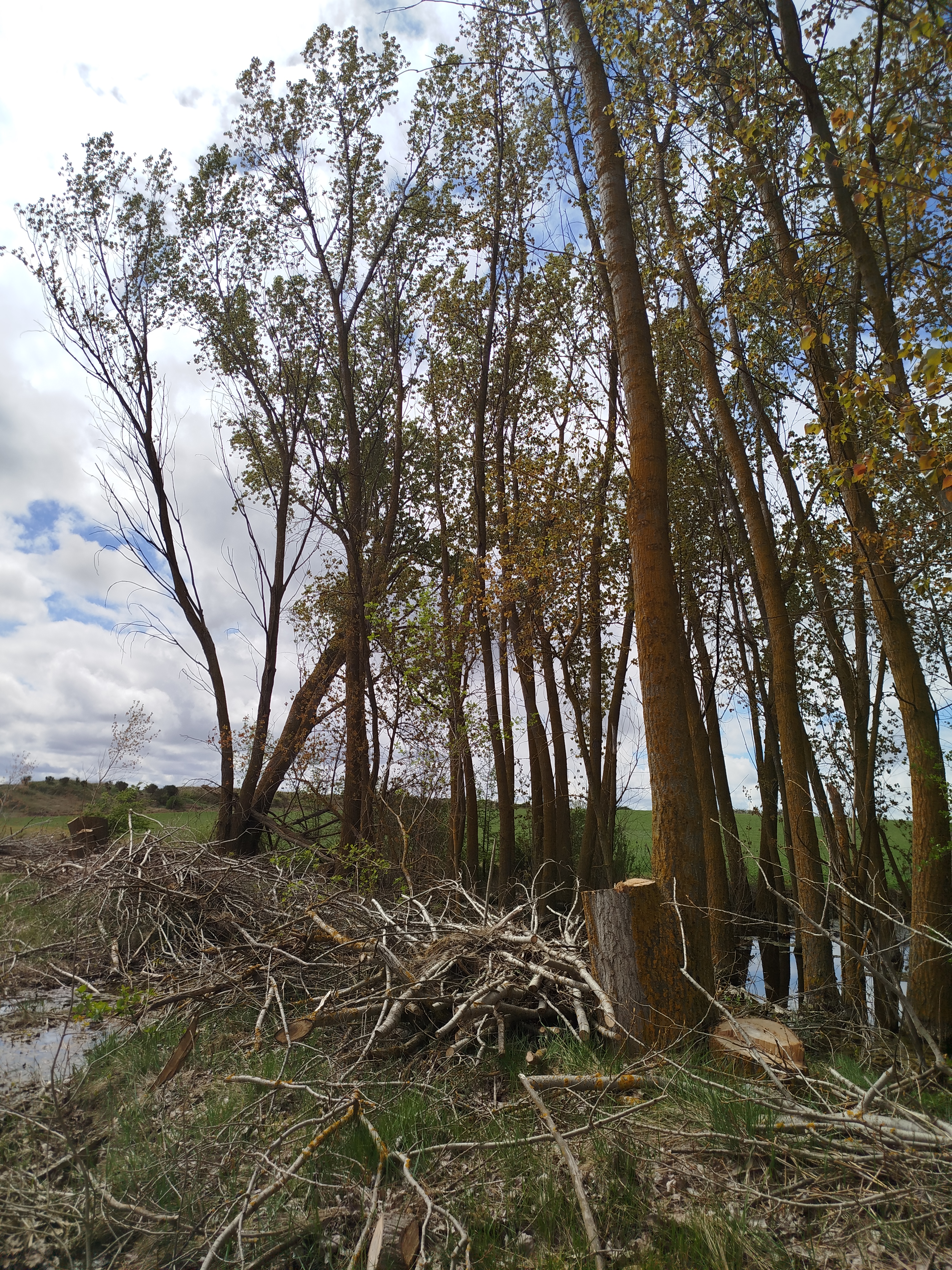 Seguimos adelante y tras varios quiebros, en los cuales aparecen también nuevos ejemplares talados de grandes dimensiones, totalmente sanos, alcanzamos la esclusa de retención del Canal y la derivación por la cual se inicia el canal de riego que se dirige hacia Palencia. Junto a él crecía un precioso rodal de álamos temblones, Populus tremula, la mayor parte de esos ejemplares, totalmente sanos y que no suponían ninguna amenaza, estos fueron eliminados, dos de ellos, uno situado hacia el vaso del canal próximo a la caseta de regulación de las antiguas puertas de la esclusa de retención fueron talados parcialmente quedando de este desaguisado como se muestra a continuación.