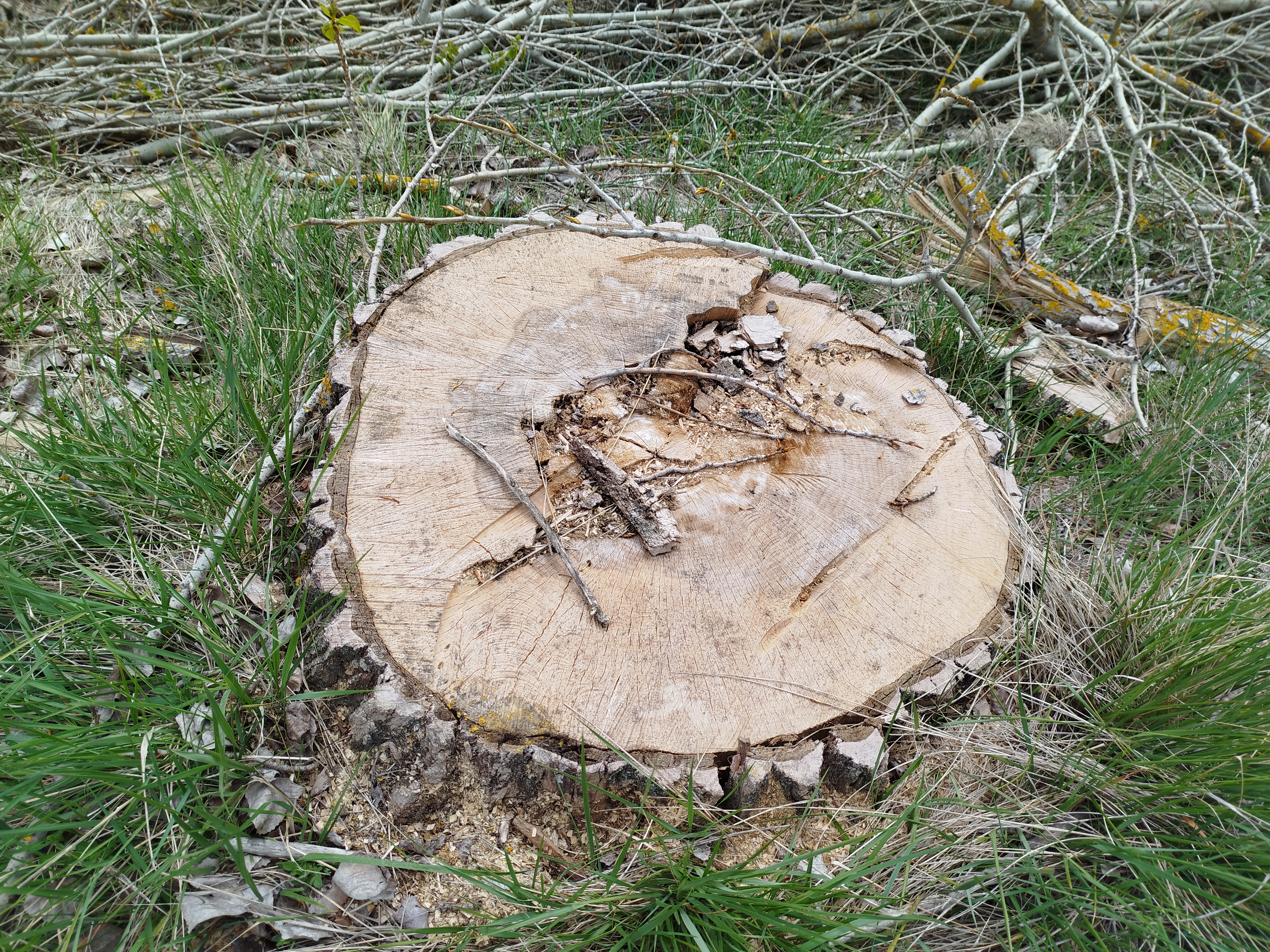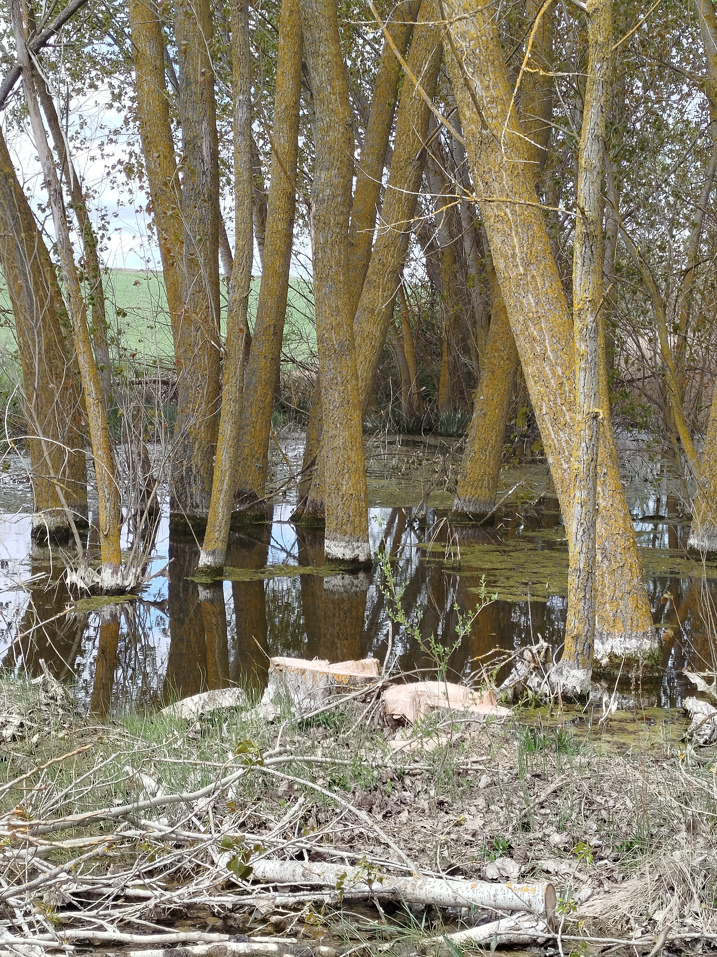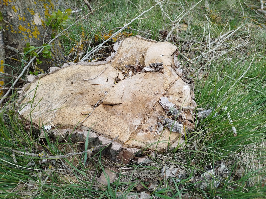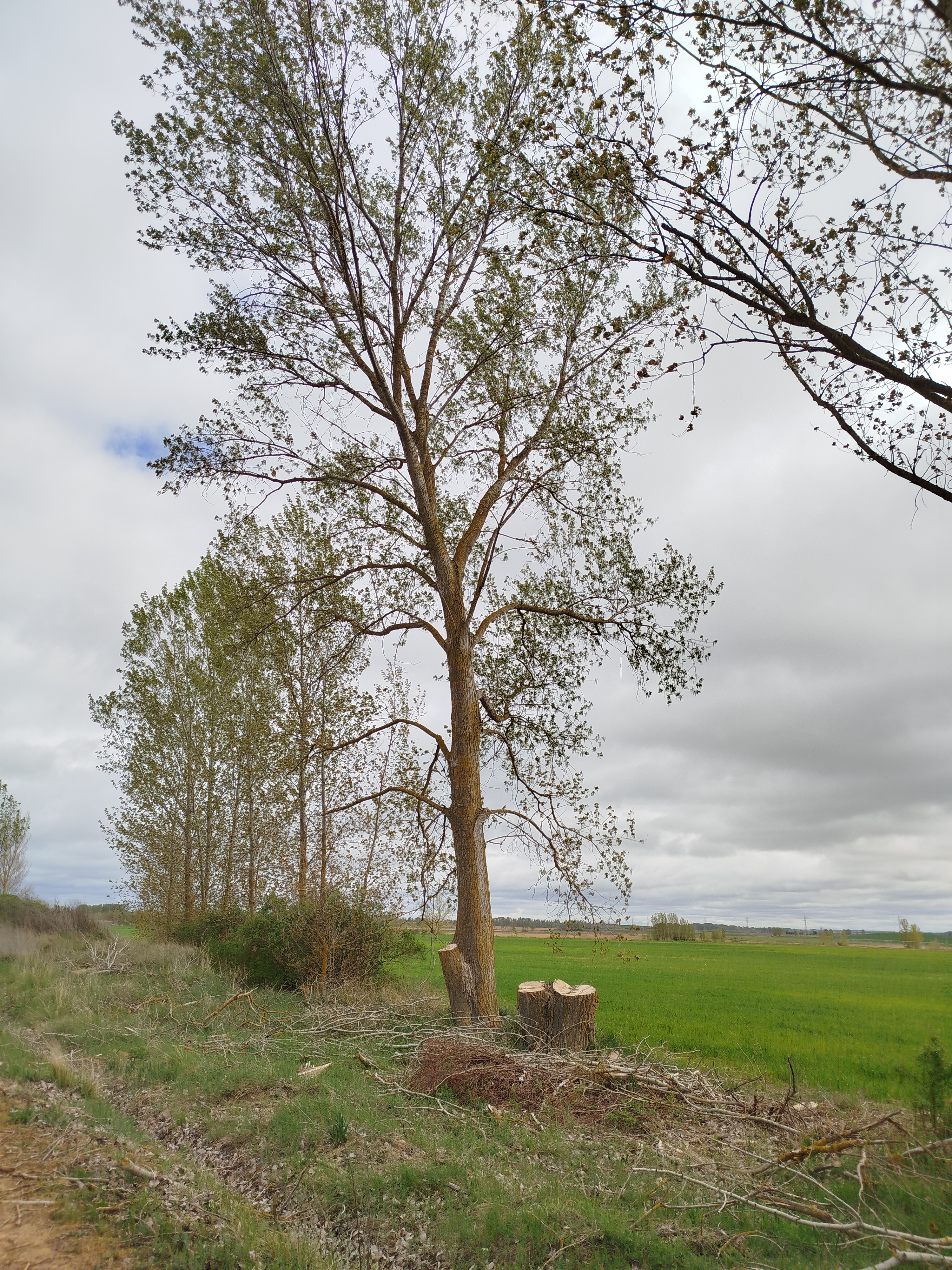 Seguimos adelante y tras varios quiebros, en los cuales aparecen también nuevos ejemplares talados de grandes dimensiones, totalmente sanos, alcanzamos la esclusa de retención del Canal y la derivación por la cual se inicia el canal de riego que se dirige hacia Palencia. Junto a él crecía un precioso rodal de álamos temblones, Populus tremula, la mayor parte de esos ejemplares, totalmente sanos y que no suponían ninguna amenaza, estos fueron eliminados, dos de ellos, uno situado hacia el vaso del canal próximo a la caseta de regulación de las antiguas puertas de la esclusa de retención fueron talados parcialmente quedando de este desaguisado como se muestra a continuación.