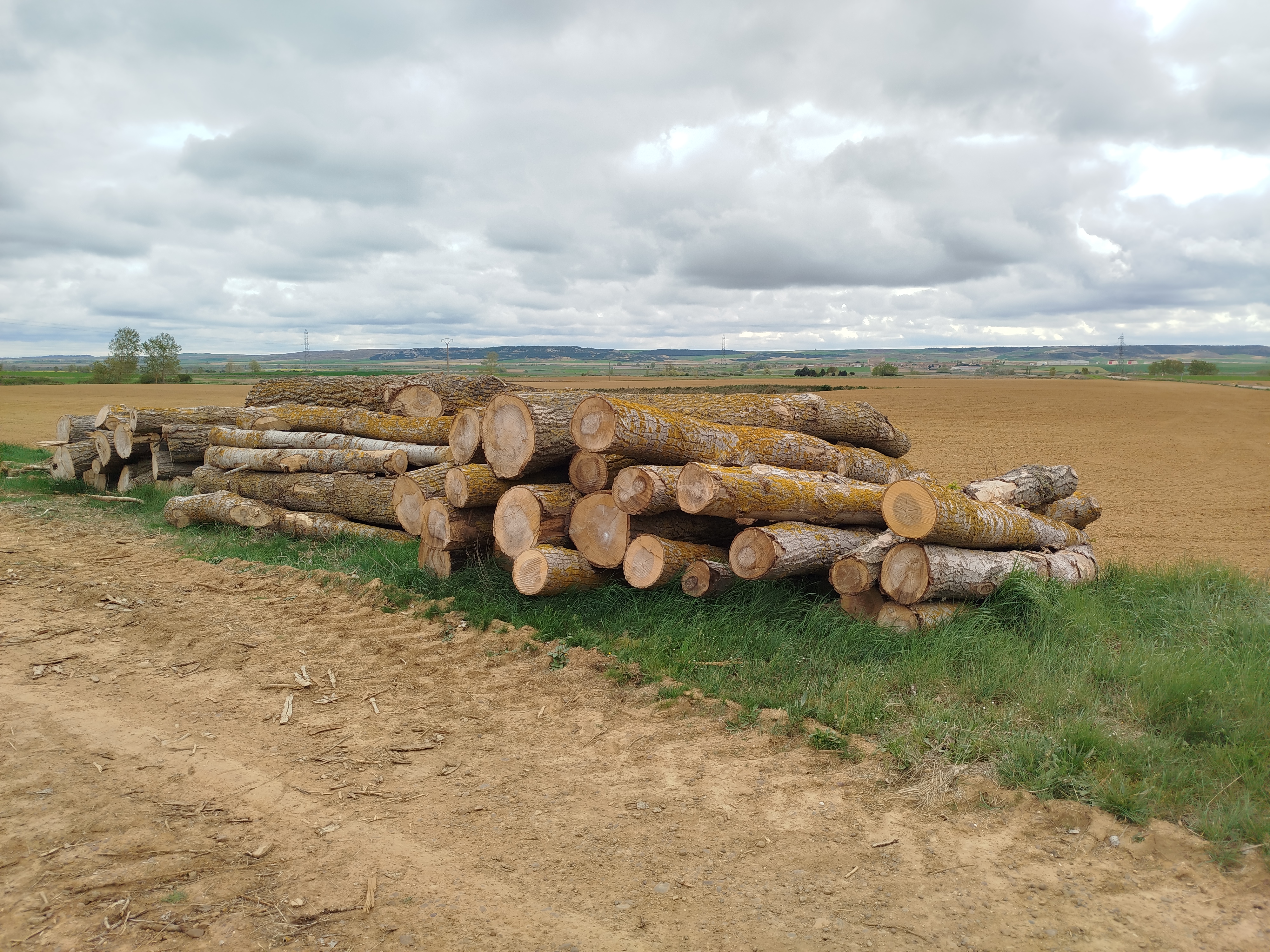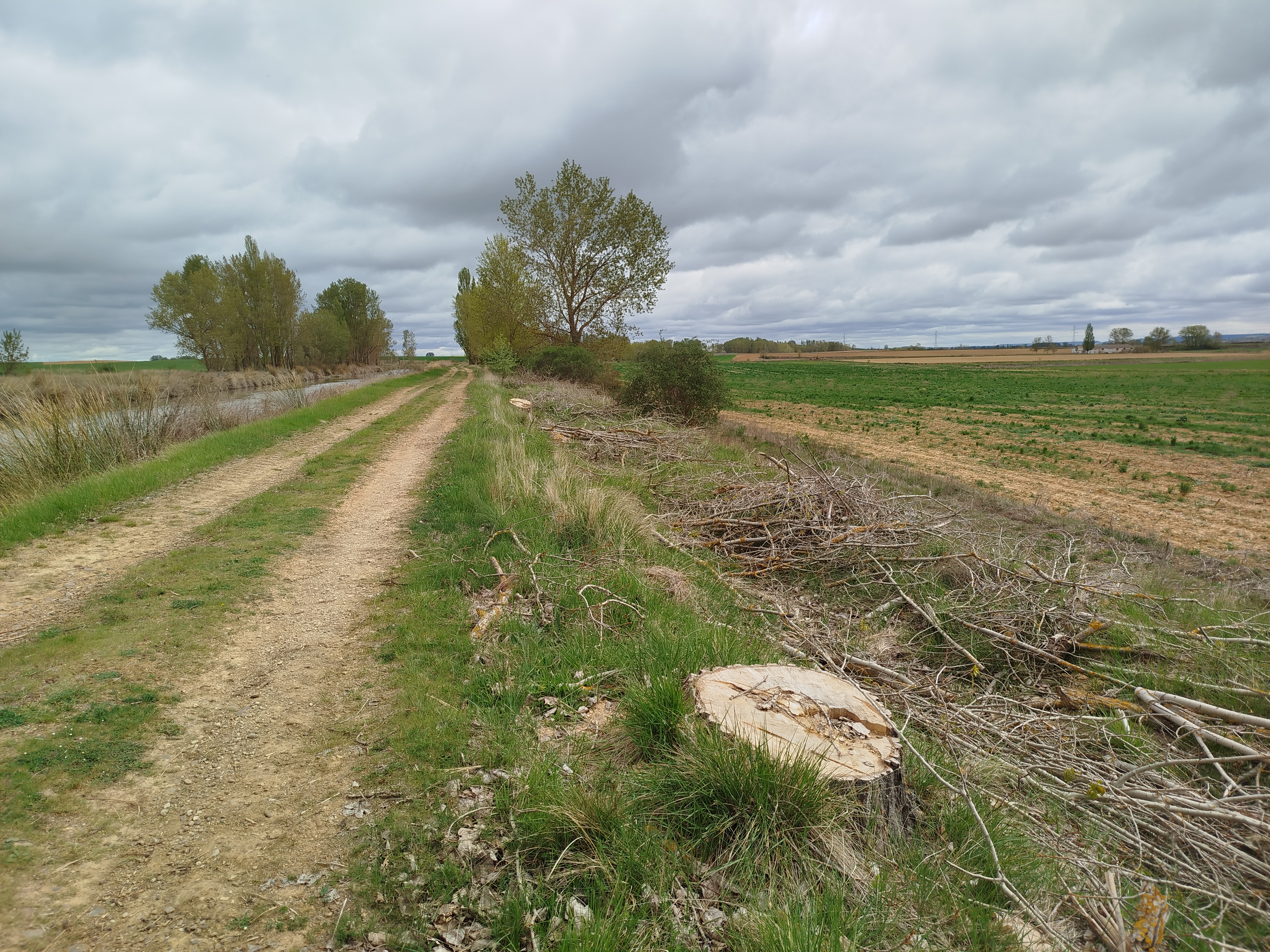 Continuamos y en una larga recta de aproximadamente 1 km el paisaje que habíamos conocido en otras ocasiones, con un arbolado compuesto de grandes, sanos y esbeltos ejemplares, estos habían desaparecido, quedando a la vista los tocones, denotando su gran tamaño y solo pequeños trozos aún sin retirar de las salvajes cortas que se había realizado en la zona. El paisaje era totalmente desolador, en una zona siempre arbolada, al abrigo de la agradable sombra que proporcionaban las copas de aquellos árboles, sobre todo bien recibida durante la época estival, había desaparecido para siempre de nuestra mirada. Todo era silencio, los pájaros que en tantas otras ocasiones centraban con algarabía nuestra atención, ya no estaban, solo quedaba la vista despejada de los campos de monocultivo cerealista adyacentes. Enfrente, o sea, en la margen izquierda del Canal por la que luego pasaríamos a nuestro regreso, nos quedamos atónitos contemplando nuevamente como allí se apilaban nuevamente entre el Canal de Castilla y el canal de riego de Palencia pilas con ingente cantidad de troncos.