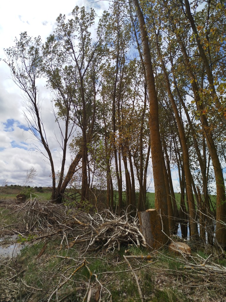 Creo que una imagen vale mas que mil palabras, como de participar la CHD en la implantación del proyecto «Life» de «Restauración y gestión de las lagunas ZEPAS del Canal de Castilla, a la «gestión forestal» que está efectuando ahora porque subcontrata las obras a una empresa la cual no se le supervisa la ejecución del trabajo encomendado ¿o es lo que realmente la CHD deseaba hacer?.En esta imagen se puede comprobar como se eliminan ejemplares totalmente sanos y que no mostraban signos de inclinación tan evidente hacia la parva o camino de sirga, mientras que en cambio los que si superan el 15% de inclinación, tal y como figura en el pliego de condiciones se mantienen ¿será porque no están inclinados hacia la parva o camino de sirga?. Por cierto ninguno de ellos se puede comprobar que tampoco se encuentran calcinados como los 1.250 ejemplares que dice la CHD que había que retirar por el incendio acaecido el 25 de agosto de 2025.En esta imagen tambien se puede comprobar (amén del brutal destrozo en el camino), como se eliminan ejemplares totalmente sanos y que no mostraban signos de inclinación tan evidente hacia la parva o camino de sirga, mientras que en cambio los que si superan el 15% de inclinación, tal y como figura en el pliego de condiciones se mantienen ¿será porque no están inclinados hacia la parva o camino de sirga?. Por cierto ninguno de ellos se puede comprobar que tampoco se encuentran calcinados como los 1.250 ejemplares que dice la CHD que había que retirar por el incendio acaecido el 25 de agosto de 2025.Brutal destrozo de la parva o camino de sirga al paso de los vehículos que han realizado las talas.Brutal tala de tres ejemplares de chopo totalmente sanos, tanto desde el punto de fista fitosanitario como estructural, en las proximidades del Punto de Valdemudo. Por cierto ninguno de ellos se puede comprobar que tampoco se encuentran calcinados como los 1.250 ejemplares que dice la CHD que había que retirar por el incendio acaecido el 25 de agosto de 2025.Brutal tala de ejemplares de chopo totalmente sanos, tanto desde el punto de fista fitosanitario como estructural, en las proximidades del Punto de Valdemudo. Por cierto ninguno de ellos se puede comprobar que tampoco se encuentran calcinados como los 1.250 ejemplares que dice la CHD que había que retirar por el incendio acaecido el 25 de agosto de 2025.Campamento base donde la empresa adjudicataria de las talas apilaba los troncos y la maquinaria junto al Puente de Valdemudo.