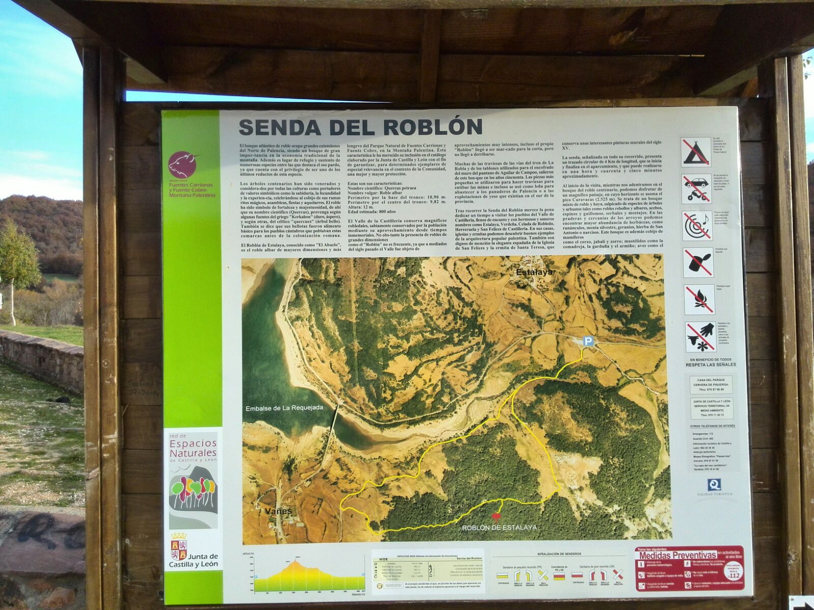 En el entorno al Valle del río Castillería, concretamente entre Vañes, Estalaya y San Felices de Castillería, no podía faltar la indiscutible visita al Bosque de Estalaya en el monte San Cristobal dónde además de disfrutar de un agradable paseo de unas 2 horas de duración, apto para toda la familia, a través de un circuito de menos de 5 km. y que se encuentra debidamente señalizado, nos permitirá adentrarnos entre grandes robles centenarios, y allí podemos descubrir a «El Abuelo» de todos los robles palentinos (hasta ahora conocido), que es varias veces centenario, se trata del Roblón de Estalaya, un viejo roble albar que se encuentra ya hueco por dentro pero que aún se resiste a dejar este mundo mostrándose ante los ojos del ser humano toda su fortaleza como lo que es…un gran roble. Sus medidas no dejan indiferente a nadie, aunque no es ya muy alto, apenas 12 m de altura, su perímetro ronda casi los 10 m. y su edad se estima entorno a los 800 años. Un árbol que con la construcción del ferrócarril llegó incluso a ser marcado para su corta, para de su madera poder hacer las traviesas necesarias sobre las cuales se apoyarían los railes, sin embargo se salvo de este hecho y hoy podemos disfrutarlo y comprender lo necesario que era entonces en la vida de las gentes el bosque y como entonces lo gestionaban, pues era un bien sumamente necesario para todos.