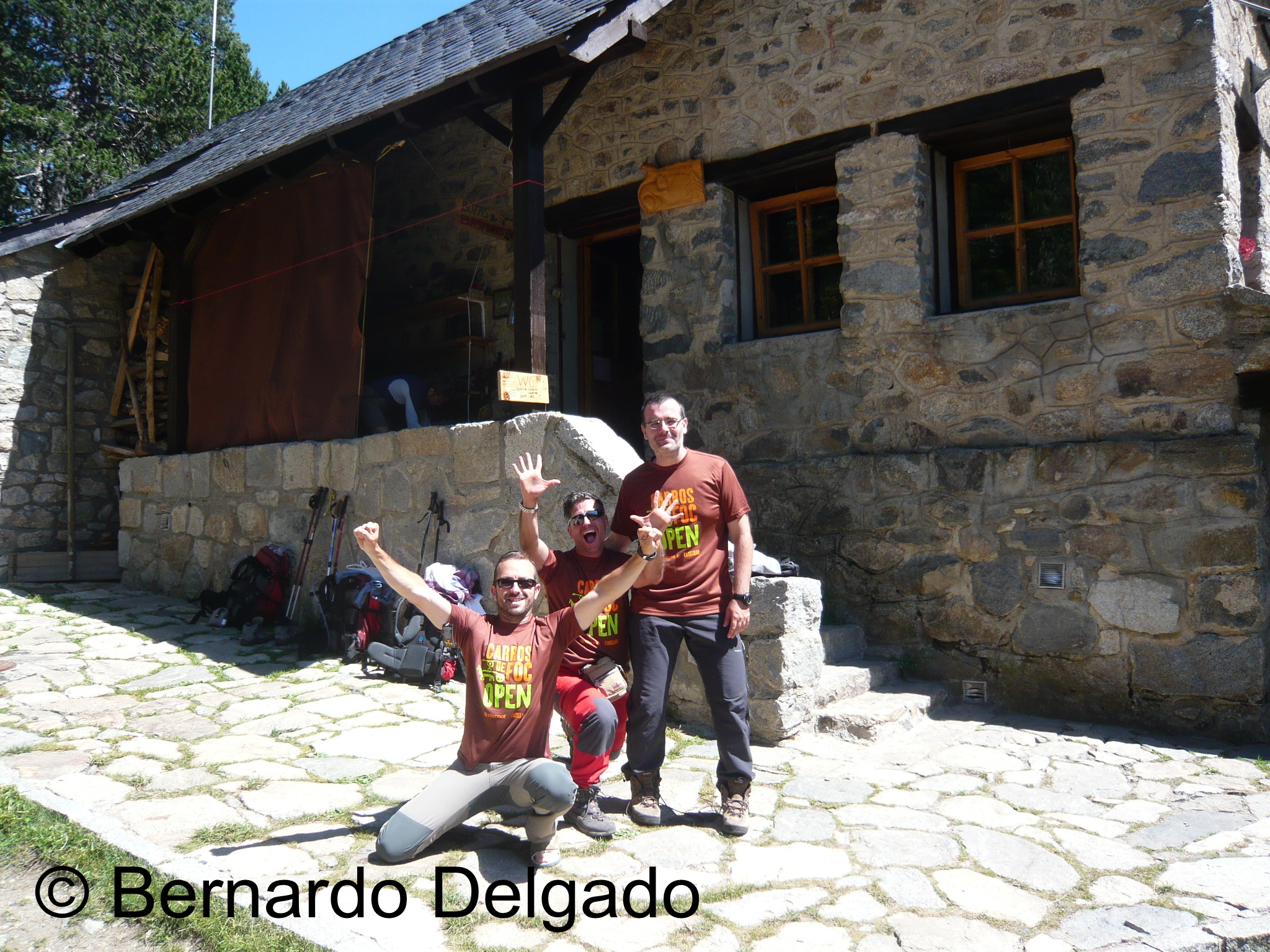 Tras despistarnos y tener que retroceder unos metros en el estany Tort, llegamos a uno de los puntos del recorrido donde es más facil perderse, ya que el camino se bifurca y la intuición (y el cansancio) suele hacer a los montañeros tomar la decisión errónea de coger el camino que desciende hasta el refugio del estany Gento. Aquí nos dimos cuenta del vértigo que tiene Jose al atravesar las presas que cierran algunos lagos. En este momento se inició una discusión interminable para ver si los lagos eran lagos o presas y si Somiedo era más bonito que Aigëstortes o viceversa… a Guille le pueden los colores. Al final tomamos el camino correcto y conocimos a los «vascos2» dos chicas y un chico muy majetes que tenían alguna duda sobre el camino a tomar. Desde ahí fuimos juntos hasta el refugio de Colomina, viendo a lo lejos el otro refugio que da lugar al error comentado. Encontramos un punto de cobertura telefónica, el cual aprovechamos para mandar algún SMS y llamar a la familia y, tras un pequeño repecho final, llegamos al refugio.