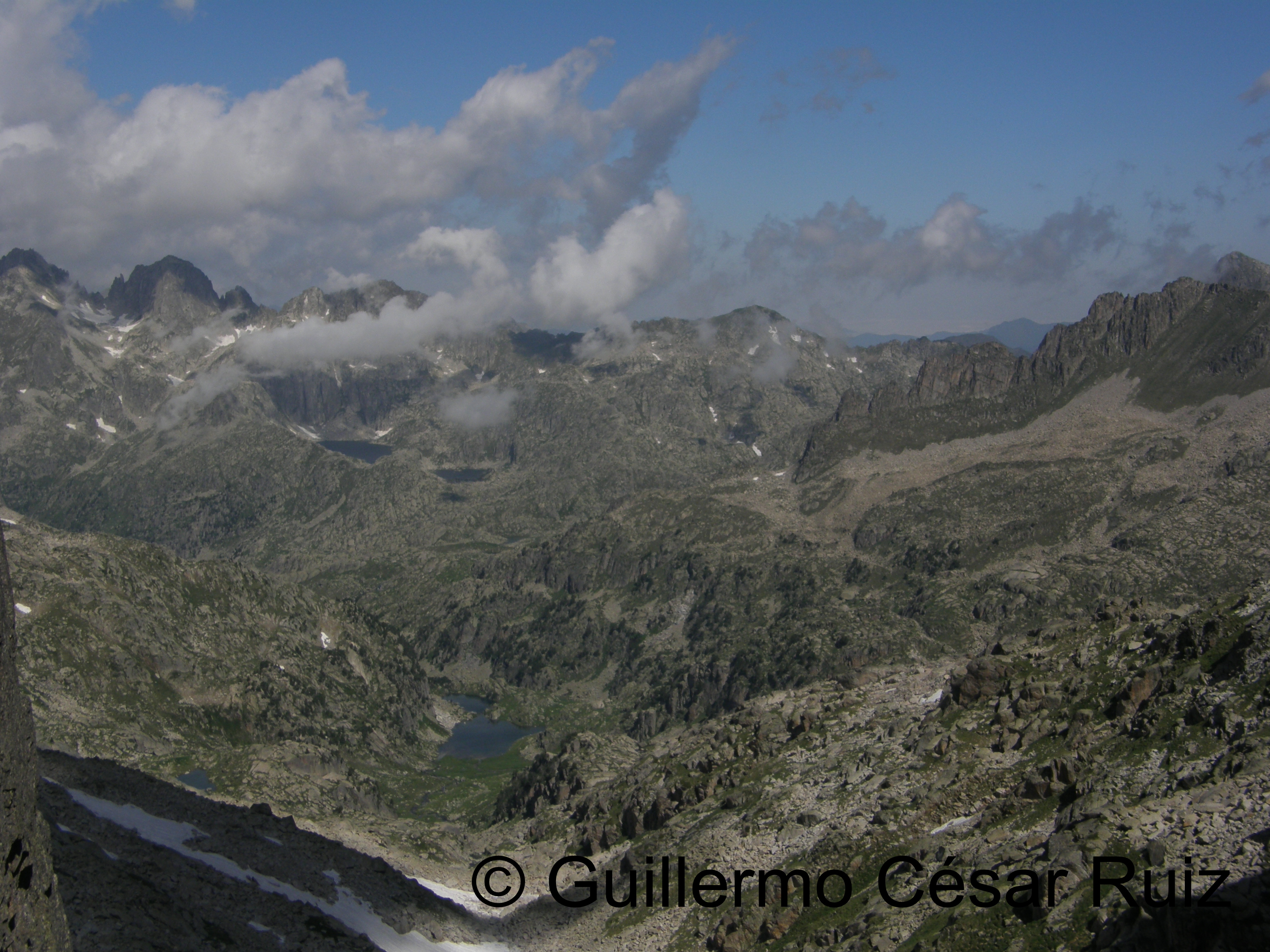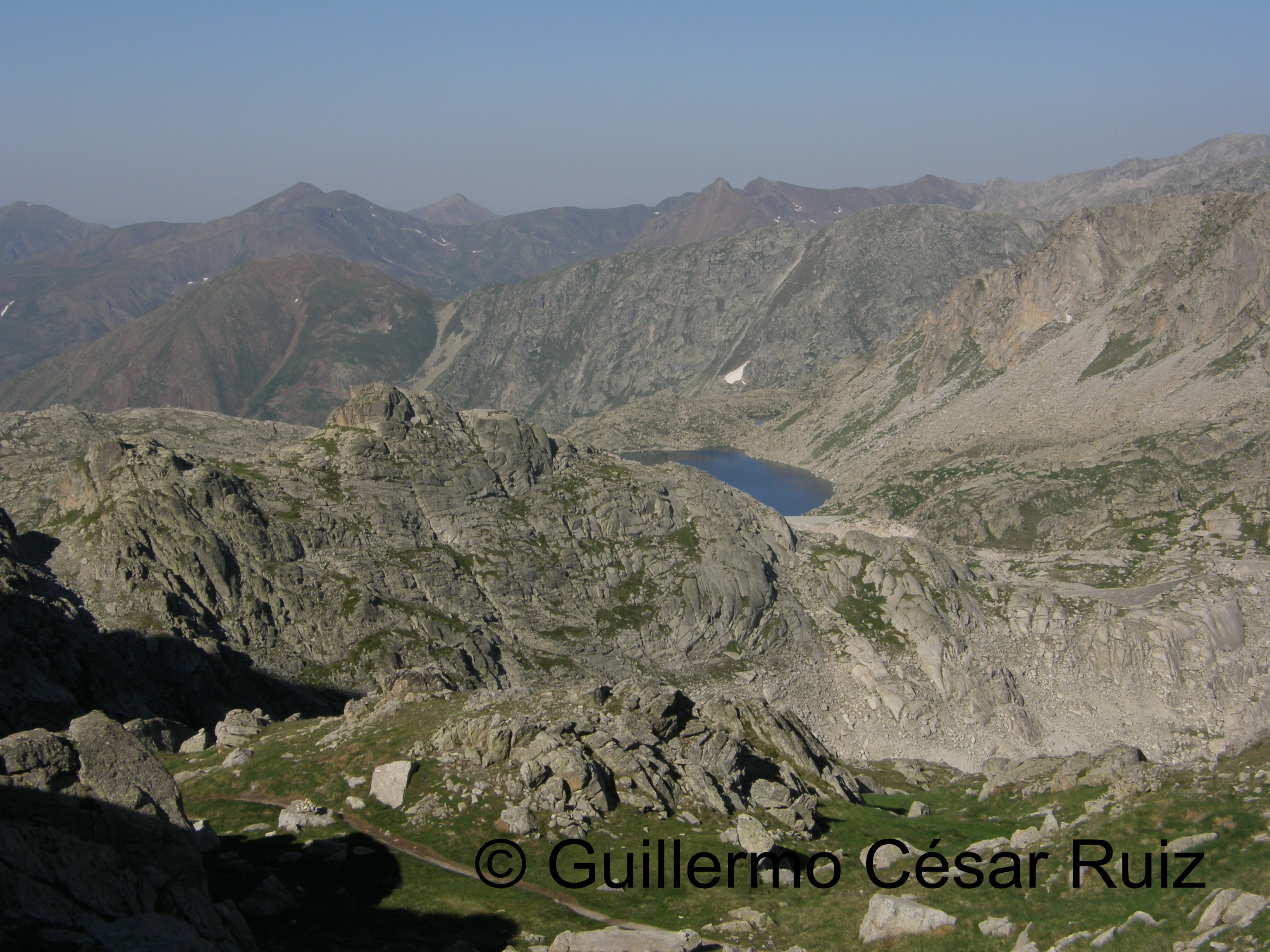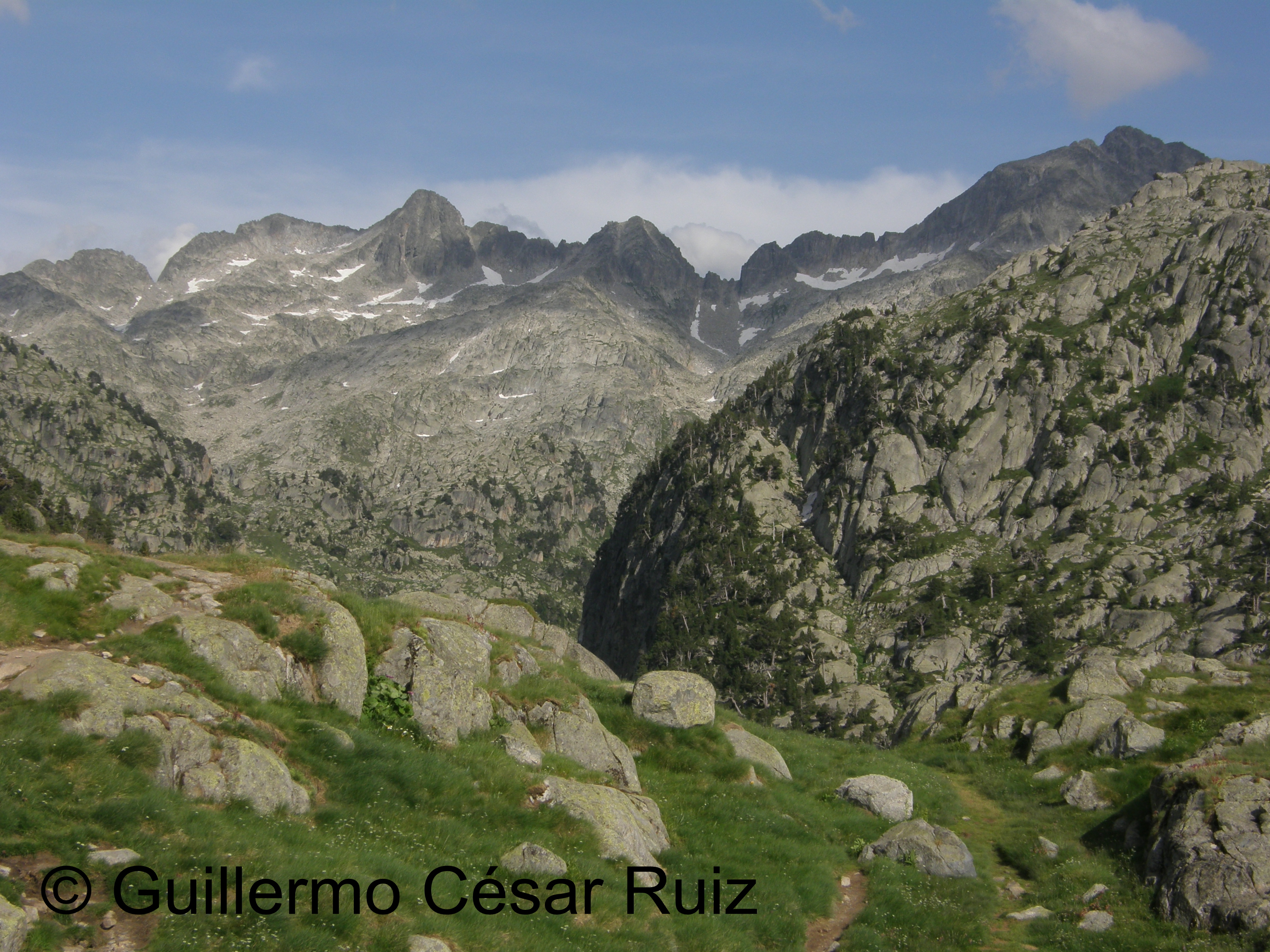 Ber coincidió con Mario y Antonio, unos asturianos que conocimos la noche anterior y a los que volveríamos a ver… Las vistas desde aquí eran realmente impresionantes, a la derecha, el pico Montardo; justo enfrente, el macizo de los Besiberris (picos de más de 3.000 m); y al fondo se alcanzaba a divisar el conjunto Aneto-Maladeta. A nuestros pies se abría una pequeña vaguada con dos caminos bien definidos, el de la izquierda que iba directamente al refugio de Ventosa (donde pasaríamos la noche) y a la derecha, el de la Restanca, que tendríamos que tomar para descender a este refugio, sellar el forfait… y luego desandarlo de nuevo. A lo lejos se comienzan a adivinar nubes de evolución que parecen confirmar las previsiones meteorológicas.