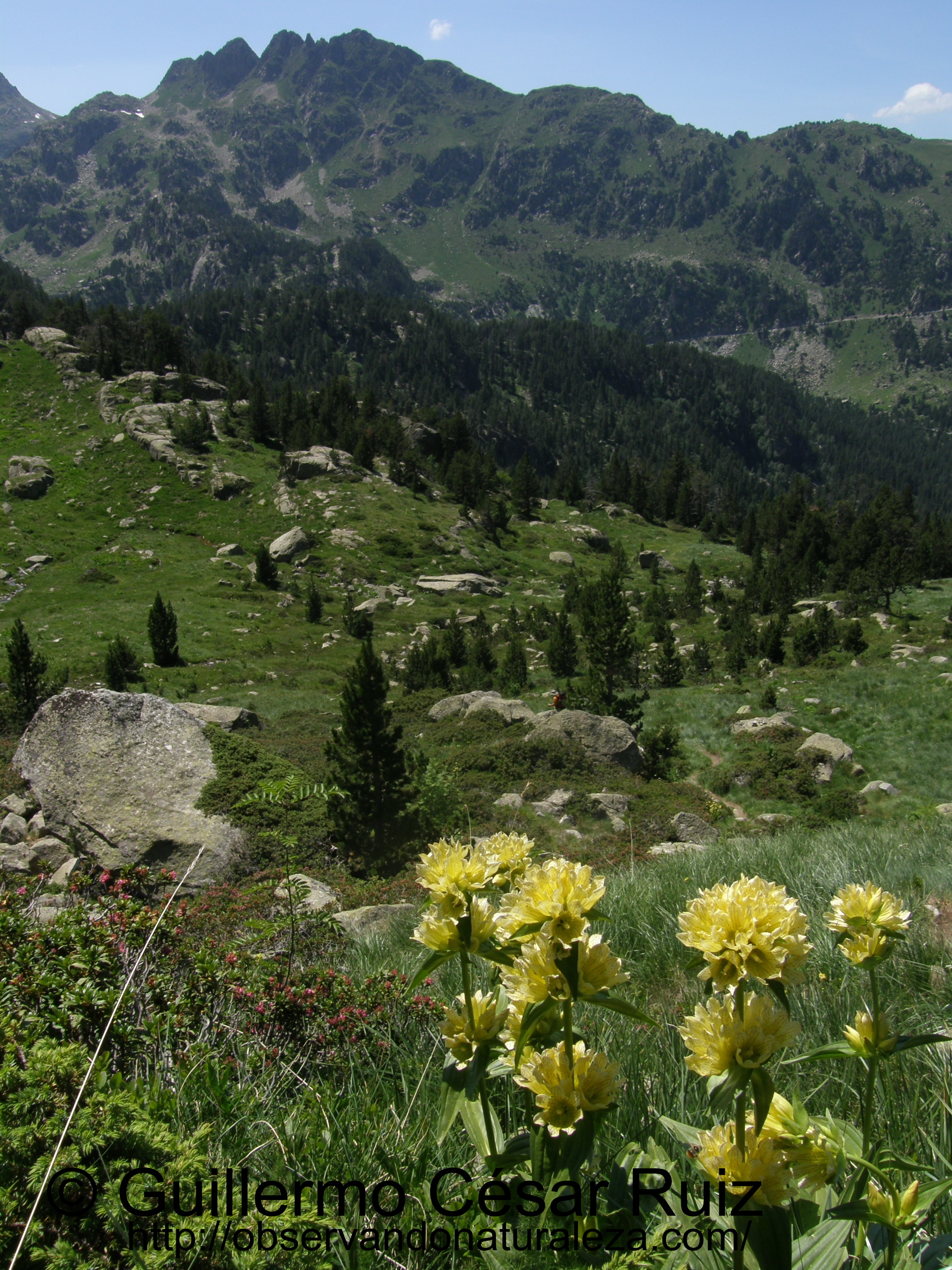 Delante de nuestros ojos se abrió otro paisaje grandioso con lo que creíamos que sería el refugio de Colomers junto a un lago y el corazón de los Pirineos al fondo. La bajada fue una de las más duras del circuito, con 300 m de desnivel y una pendiente muy pronunciada que nos obligaba a forzar las rodillas sobremanera. En mitad del descenso nos surgieron las dudas ya que teníamos la referencia visual del refugio a nuestra izquierda pero el sendero giraba a la derecha alejándose cada vez más de esa dirección. El mapa nos confirmó que íbamos por el buen camino, ya que la senda giraba 90º una vez llegaba al fondo del valle. Antoni seguía con sus sospechas al respecto… una vez abajo y con los cuerpos bastante machacados, nos dispusimos a afrontar el último tramo bastante llano y con ligeras subidas entre prados y bastante vegetación. Guille ya no estaba a estas alturas para muchas fotografías «botánicas», a pesar de lo cual logró encontrar la «genciana de flores amarillas» (por sus endemismos los conocerás).