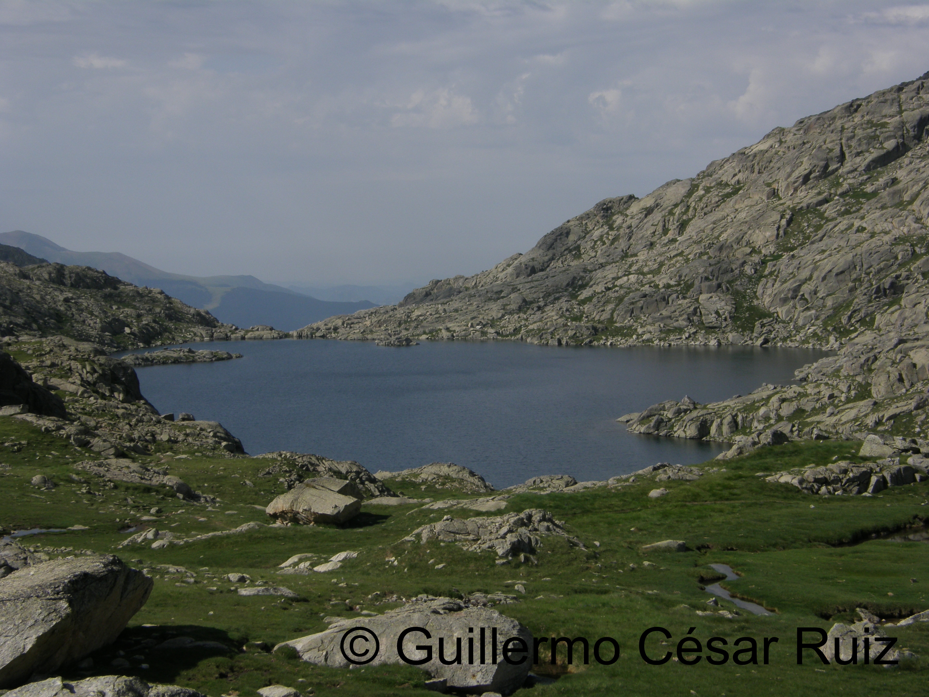 Tras recoger los equipos que nos regalan (muy buen mapa, aceptables gorra y sábana-saco y lamentable toalla), le ponemos el primer sello al forfait y el personal del refugio nos indica qué camino debemos tomar hacia el collado Dellui. Conocemos a un trío de vascos ¡cómo les gusta la montaña a los nacidos allí!, con el que coincidiremos un par de días (en adelante, «vascos1»). Tras unas pequeñas dudas sobre el valle en el que se encontraría el paso, subimos y subimos bordeando un macizo rocoso entre pinares y rododendros. Guille aprovecha cualquier momento para hacer fotografías a la flora autóctona (no podía ser menos jijiji). Dejamos a nuestra derecha los primeros lagos del recorrido (cuánta cantidad de agua llegamos a ver…), atravesamos nuestro primer canchal (todos los días tendríamos dos o tres pedreros en el camino, para sufrimiento de Guille). En algo más de dos horas llegamos al collado. Su parte final se hizo bastante dura con muchas «zetas».