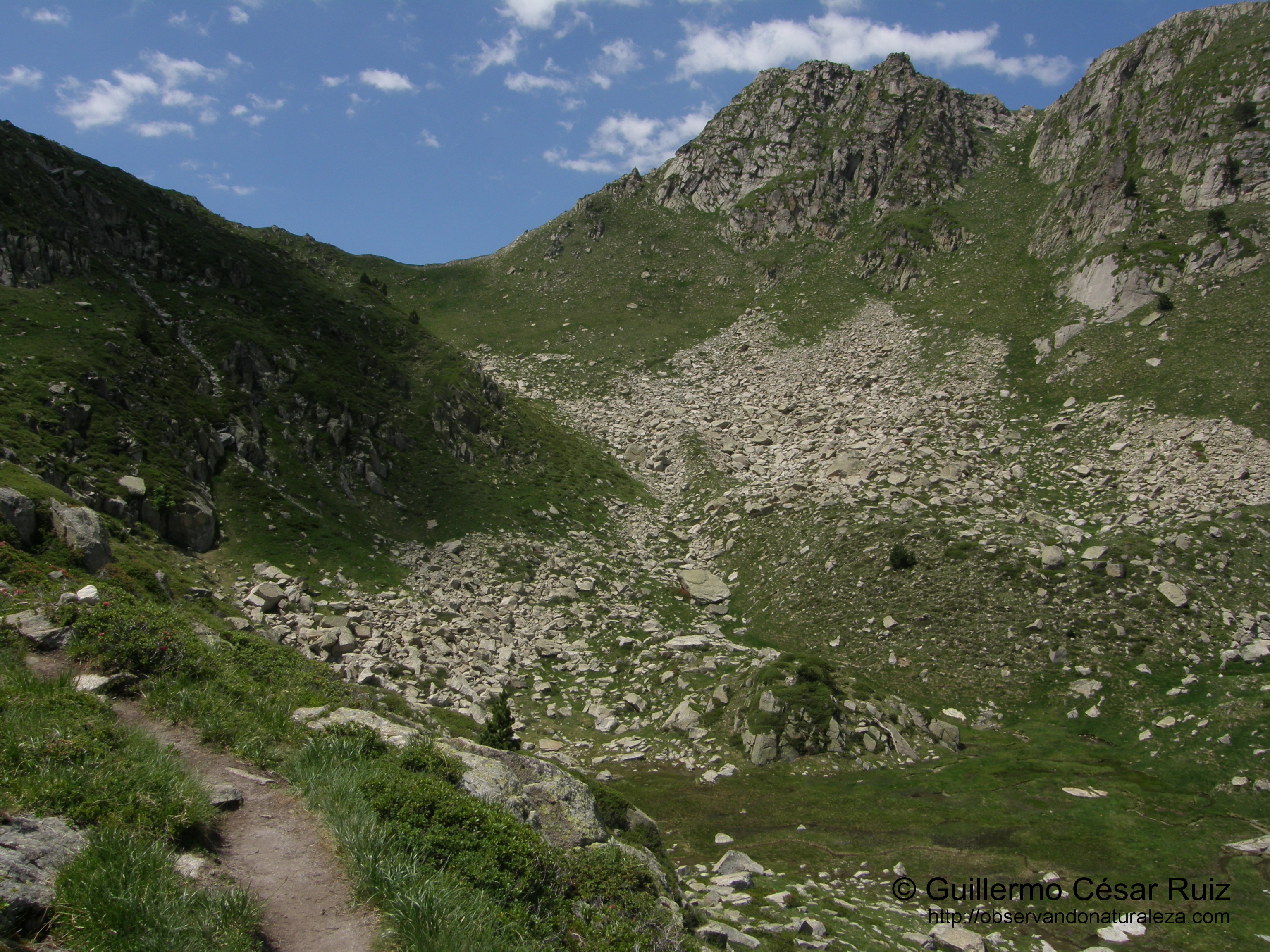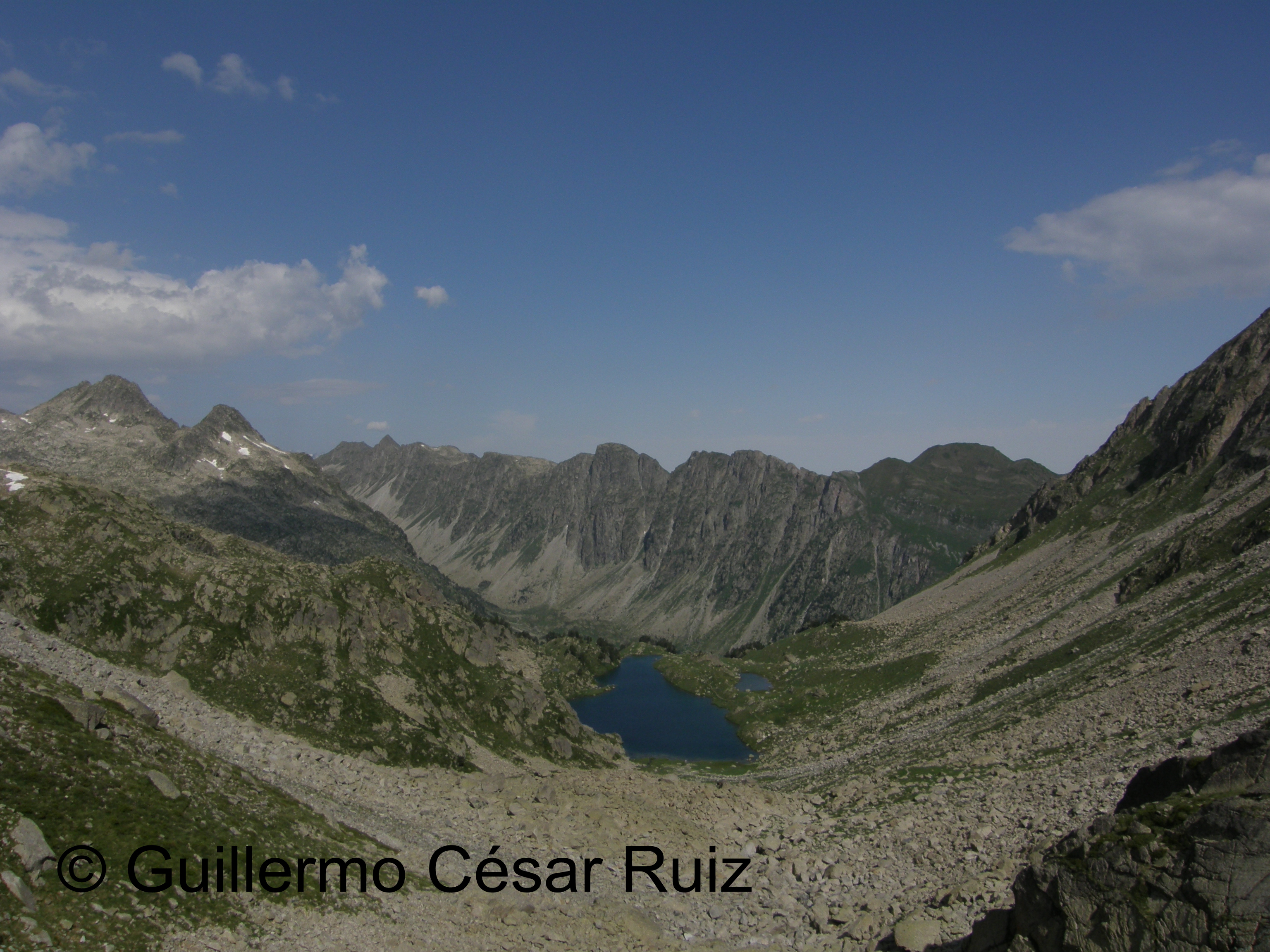 P7110015Al fondo a la izquierda ya atisbamos la collada, pasamos por una zona de canchales rodeando dos preciosas lagunas o estanyets Dellui y finalmente la laguna ol estany Dellui.