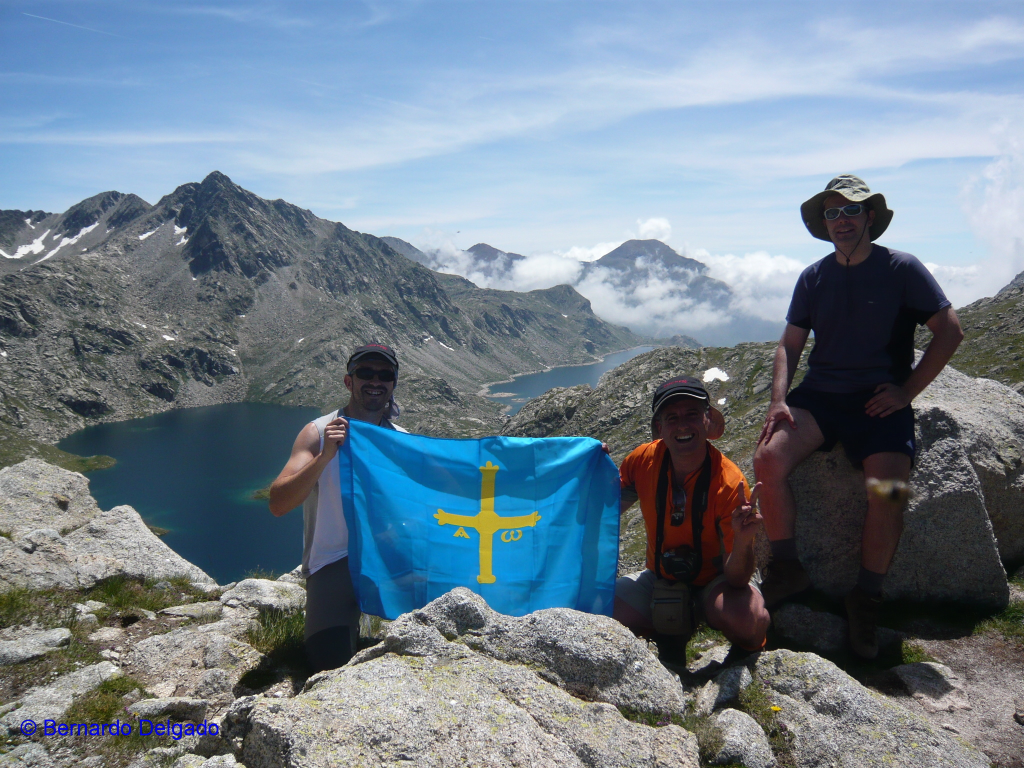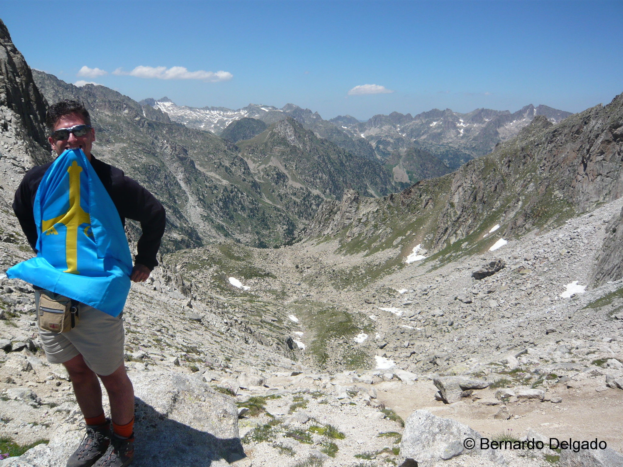 Desde el refugio habíamos salvado casi 600 m de cota y, aunque en ese momento no lo sabíamos, sería uno de los pasos con más desnivel de subida en todo el recorrido. Paramos media hora a comer parte de las provisiones que llevábamos. Todos nos esforzábamos en ofrecer nuestros manjares a los demás, con la malsana intención de ir «soltando lastre». Charlamos unos momentos con los «vascos1», que llevaban un ritmo bastante alto y habían alcanzado el collado un rato antes. Nos hicimos la foto de rigor con la bandera de Asturias y algunas fotos más, ya que las vistas eran grandiosas, con los estanys de Dellui y el valle glaciar que acabábamos de dejar atrás y los estanys de Cubieso y Tort que nos esperaban hacia el sureste. El inicio de la bajada del collado fue bastante duro, con una pendiente pronunciada para salvar unos 200 m de desnivel. Luego se tranformó en un bonito sendero más o menos llano que bordearía los dos lagos mencionados más el de Mariolo, que no se veía desde el collado. El calor apretaba…