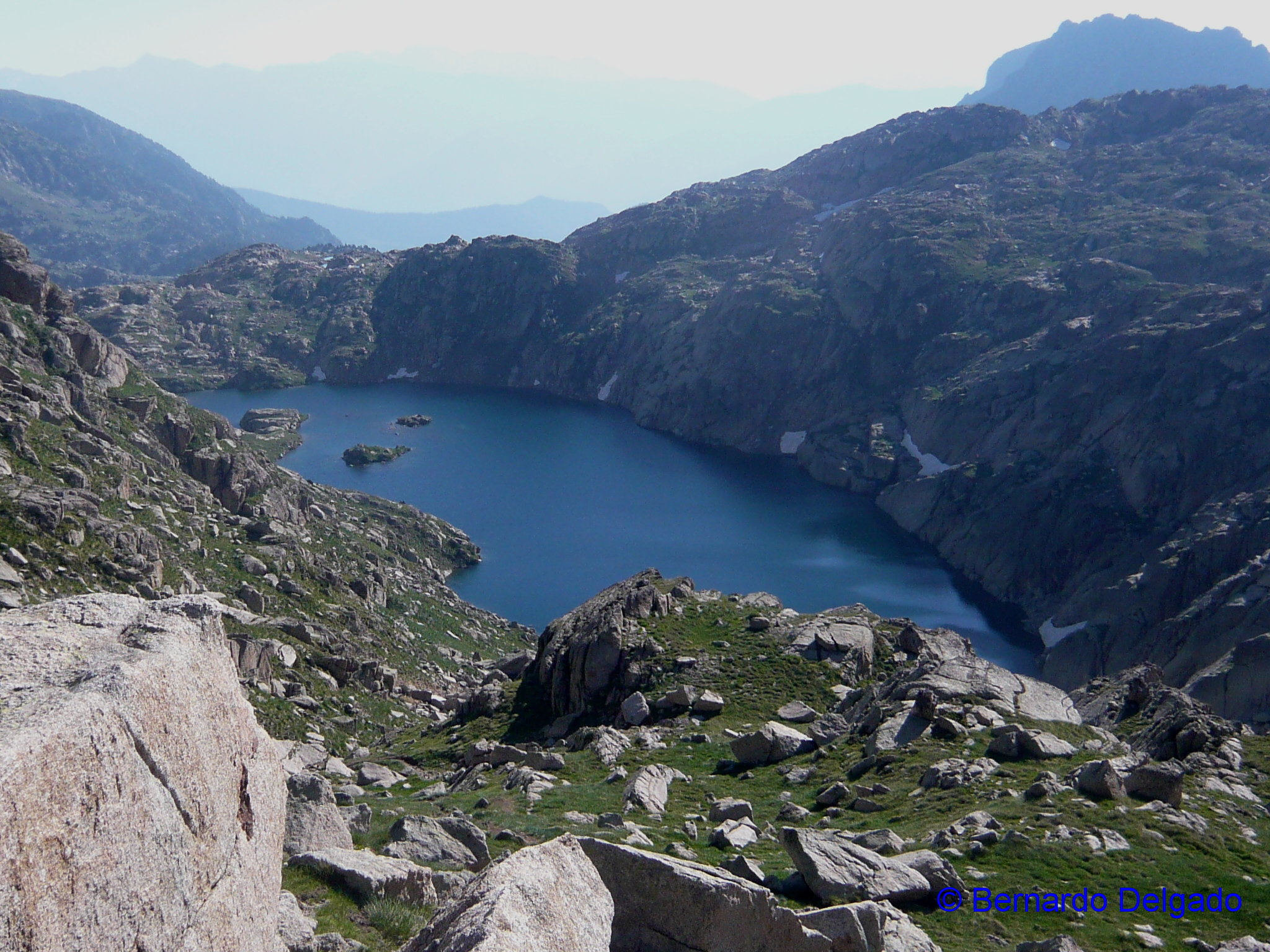 Bajada del Coll de Crestada por el canchal granítico con el Estanth deth Cap deth Pòrt enfrente.