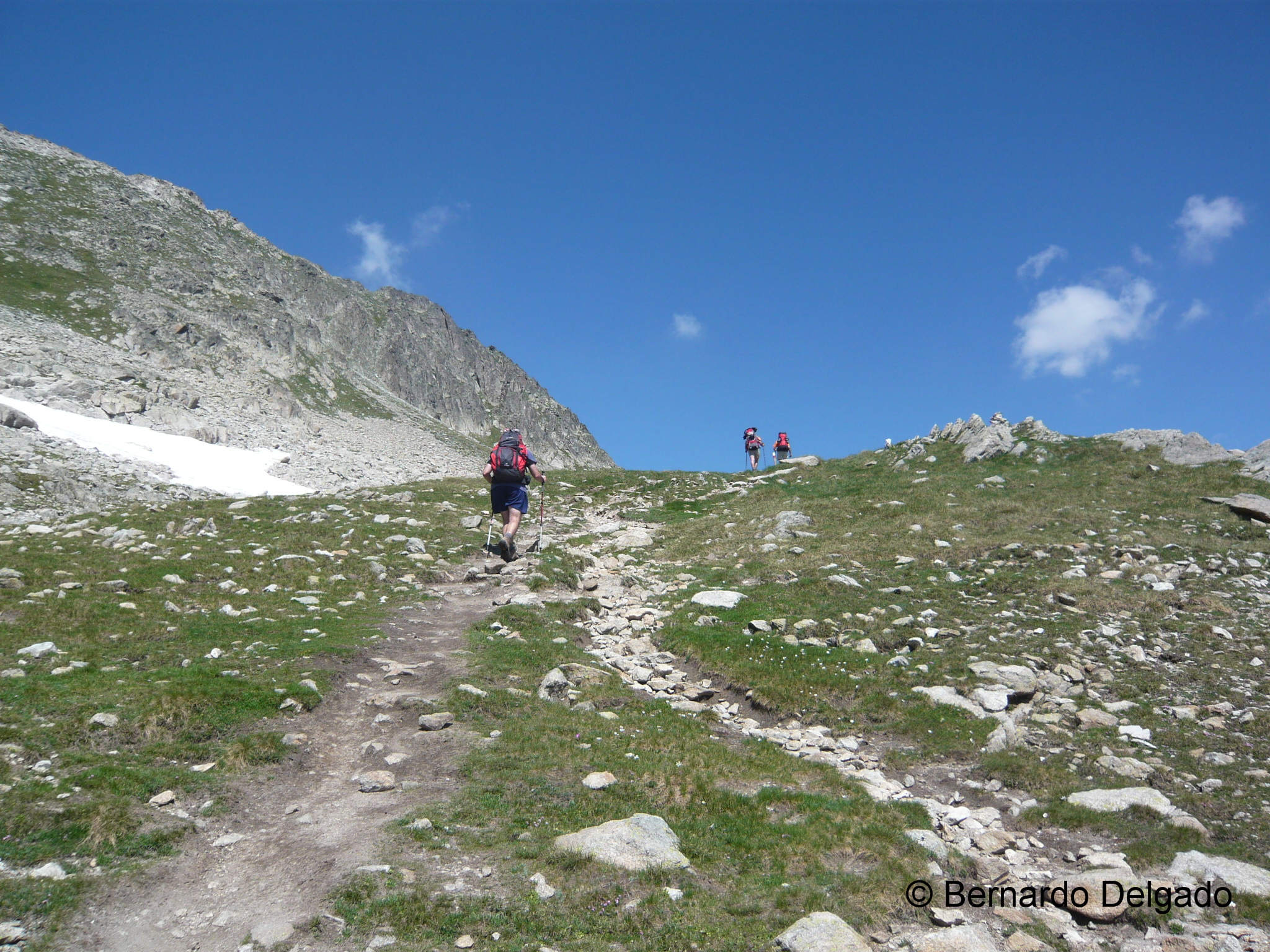Edificio grande, casi un hotel, donde fichamos (el forfait ya iba cubriéndose de sellos…) y sacamos unas buenas fotos del entorno. A partir de aquí, la pista se transforma en sendero y seguimos los cinco hacia el siguiente collado, cuya subida es relativamente cómoda y se divide en dos partes separadas por un tramo más llano alrededor de un pequeño circo glaciar (con su correspondiente pedrero, cómo no). Tras el último repecho nos encontramos con una zona de prados bastante llana y unos pequeños lagos en los que aun hay hielo alrededor. Varios grupos de montañeros descansaban en esta zona, donde se cruzan varios senderos. ¡¡Desempolva la bandera, Willy!!.