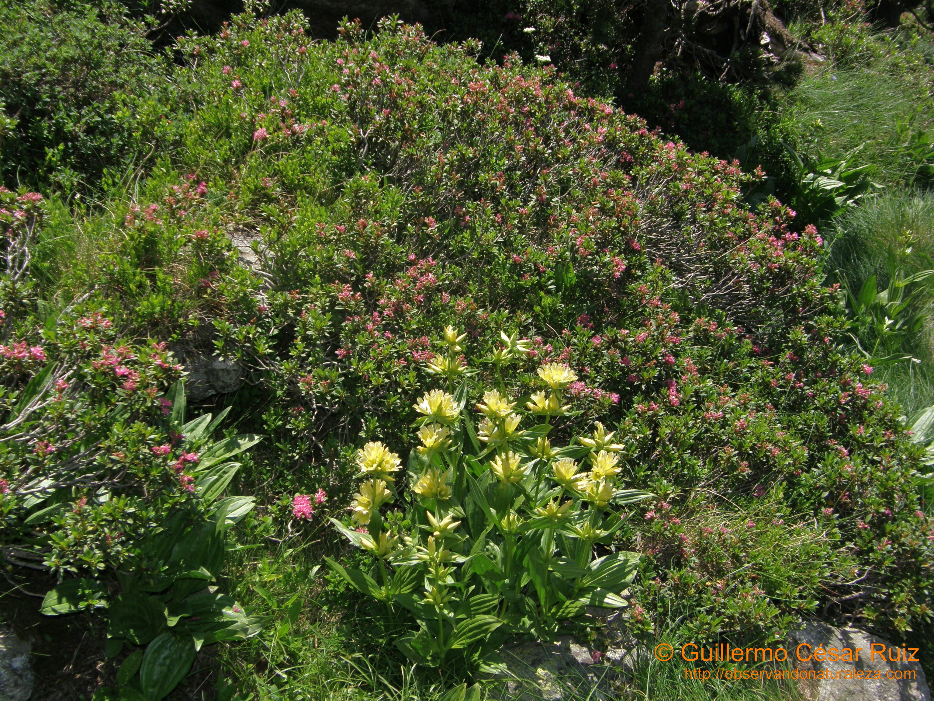 La endémica genciana de los pirineos, Gentiana burseri subsp. burseri, frecuentemente en los pastizales graníticos de los pirineos, suele encontrarse también asociado al matorral subalpino de azaleas (Rododendron ferrugineum).