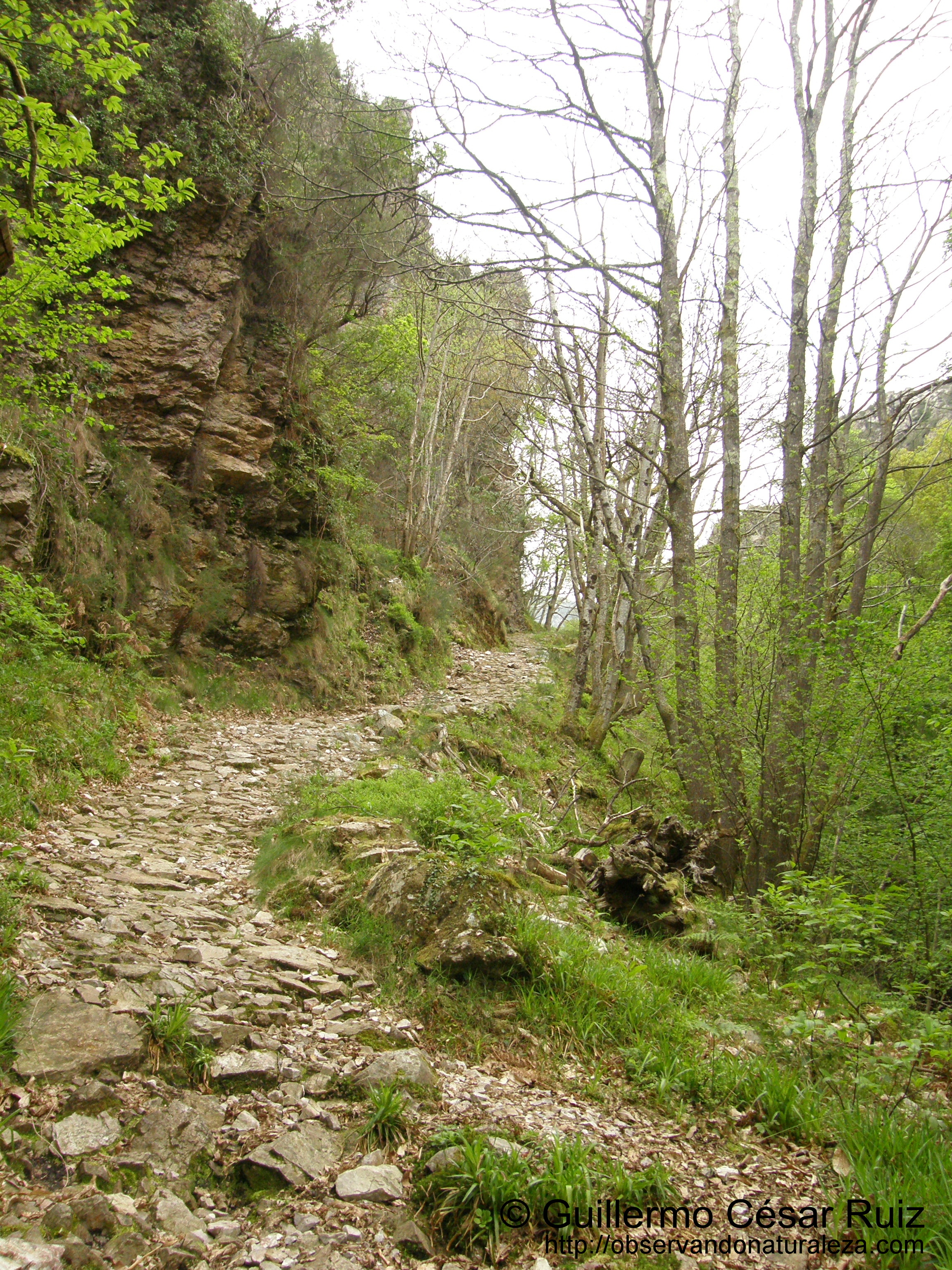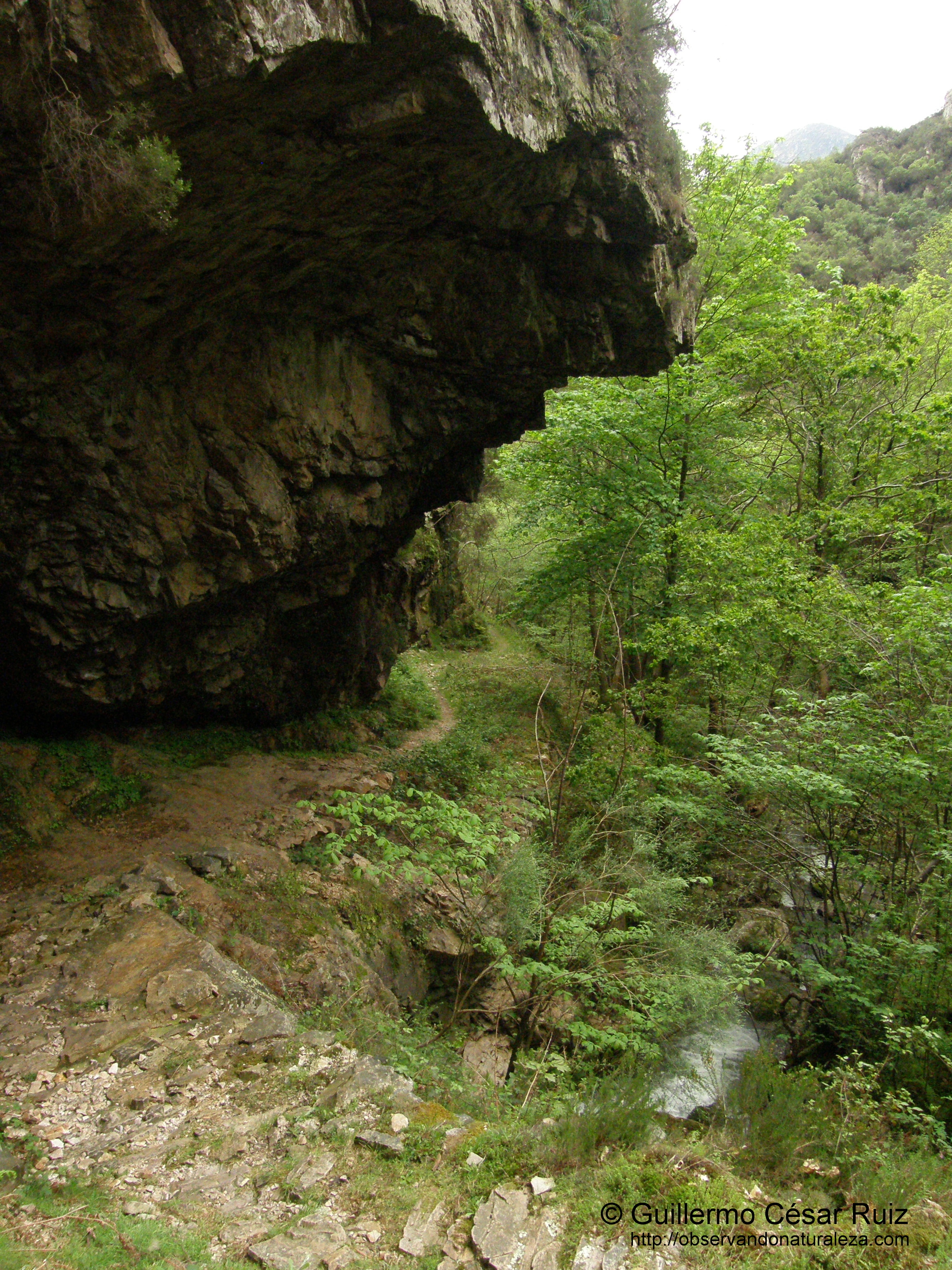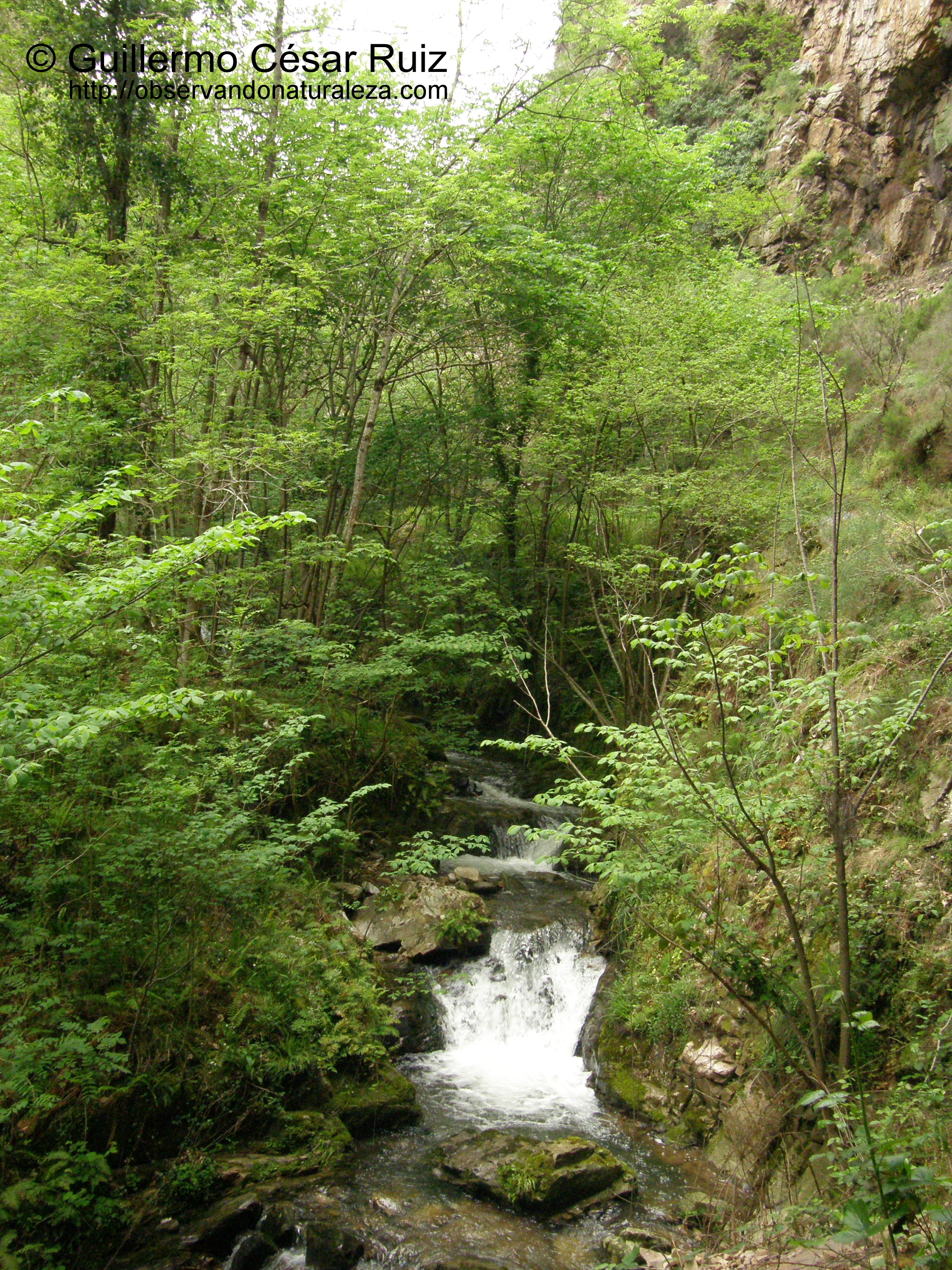 Pero los farallones de piedra de la foz nos siguen seduciendo de forma irrefrenable en nuestro continuo ascenso por la misma. Primeramente la arenisca ferruginosa de la formación Naranco tiñe de un extraño color los suelos donde la increible verticalidad de la roca se eleva de tal manera que nada más la supera en espectacular lo juntas que llegan a estar las peñas una frente a la otra, oprimiendo la atmosfera que queda entre ambas de forma sobrecogedora. Por este motivo hay tramos en los que el camíno tuvo que robar espacio a la roca para no caer en el abismo donde el agua salta al vació de tal forma que se nos pudiera poner la carne de gallina. En esta ocasión es la dura piedra cuarcítica de la formación Barrios la que crea una naturaleza sin igual, con rincones innacesibles donde un llavaculos/mirlo acuático (Cinclus cinclus) visita saltando de piedra en piedra mentando que la llondra/nutria (Lutra lutra) como sus deyecciones ponen de manifiesto una febril actividad: