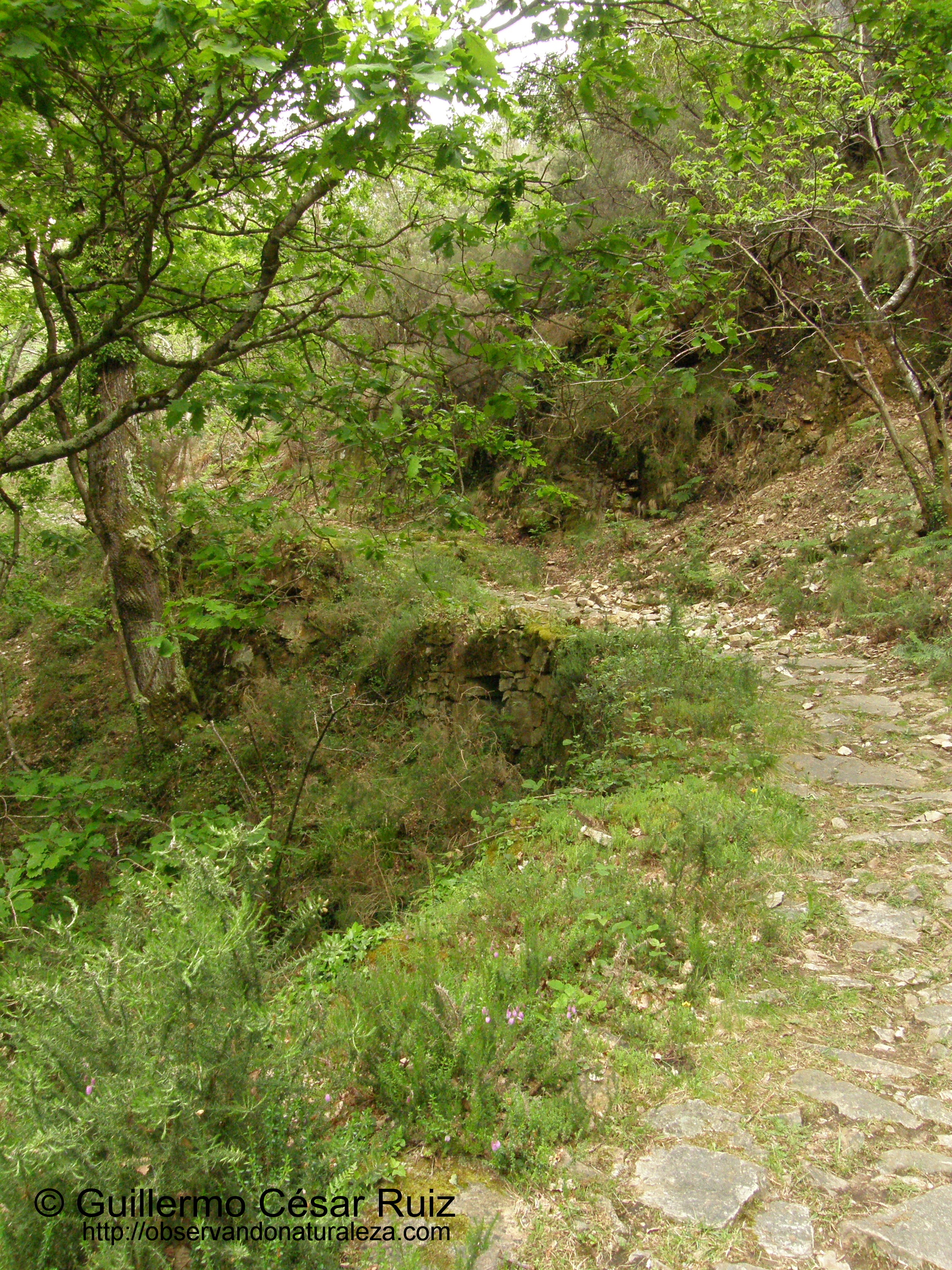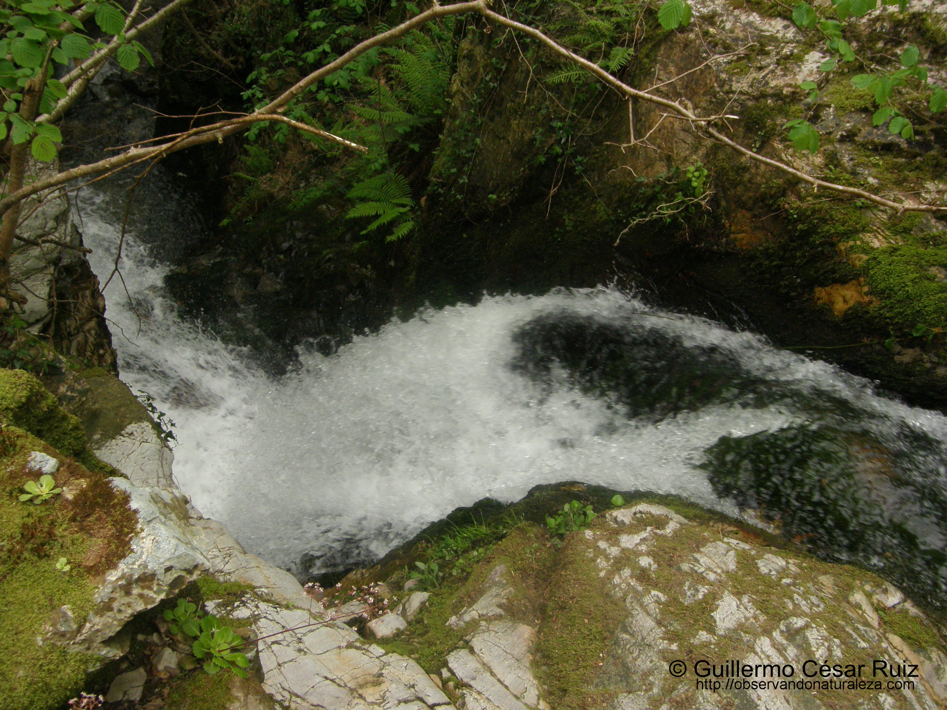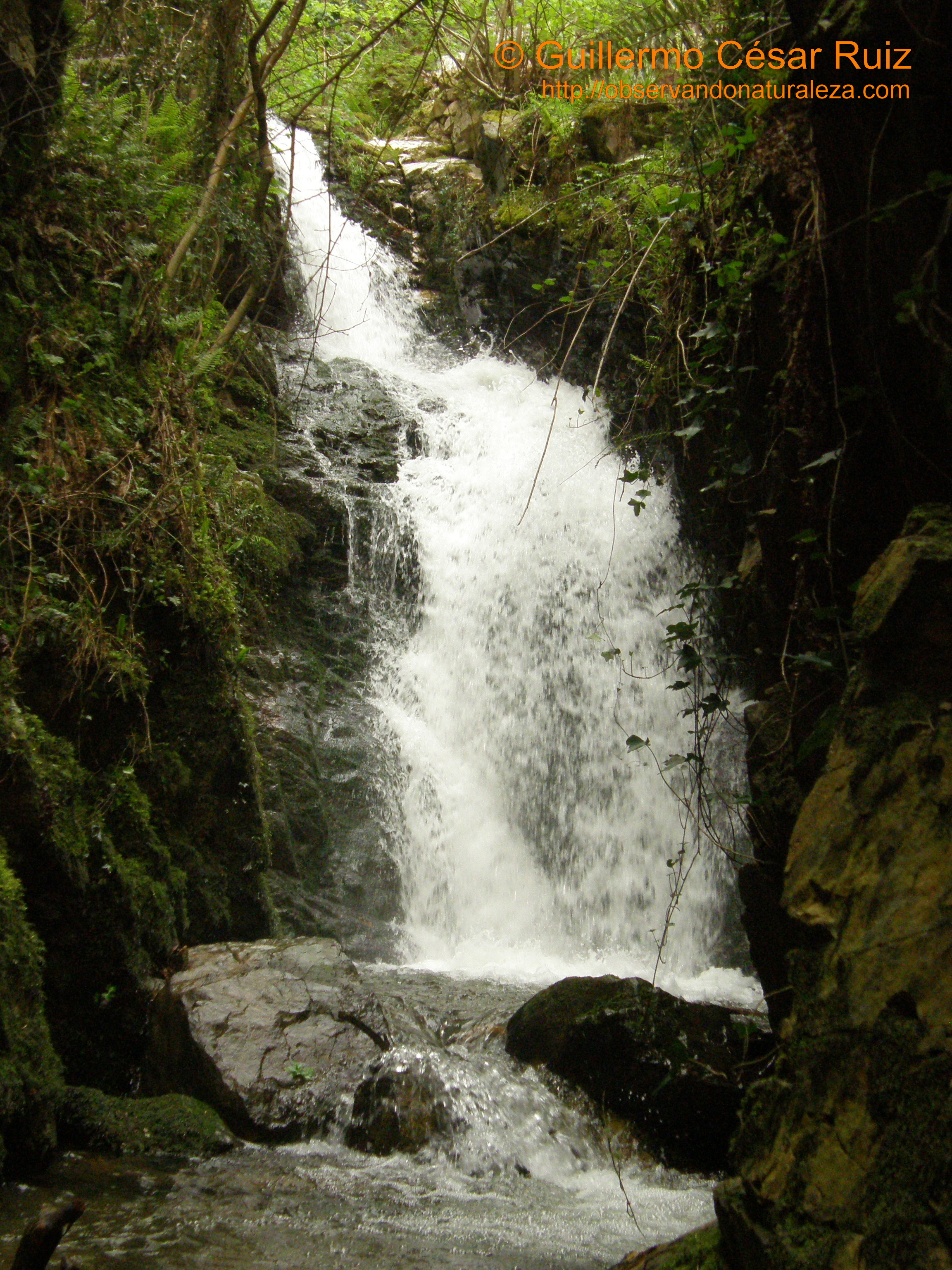 Pero los farallones de piedra de la foz nos siguen seduciendo de forma irrefrenable en nuestro continuo ascenso por la misma. Primeramente la arenisca ferruginosa de la formación Naranco tiñe de un extraño color los suelos donde la increible verticalidad de la roca se eleva de tal manera que nada más la supera en espectacular lo juntas que llegan a estar las peñas una frente a la otra, oprimiendo la atmosfera que queda entre ambas de forma sobrecogedora. Por este motivo hay tramos en los que el camíno tuvo que robar espacio a la roca para no caer en el abismo donde el agua salta al vació de tal forma que se nos pudiera poner la carne de gallina. En esta ocasión es la dura piedra cuarcítica de la formación Barrios la que crea una naturaleza sin igual, con rincones innacesibles donde un llavaculos/mirlo acuático (Cinclus cinclus) visita saltando de piedra en piedra mentando que la llondra/nutria (Lutra lutra) como sus deyecciones ponen de manifiesto una febril actividad: