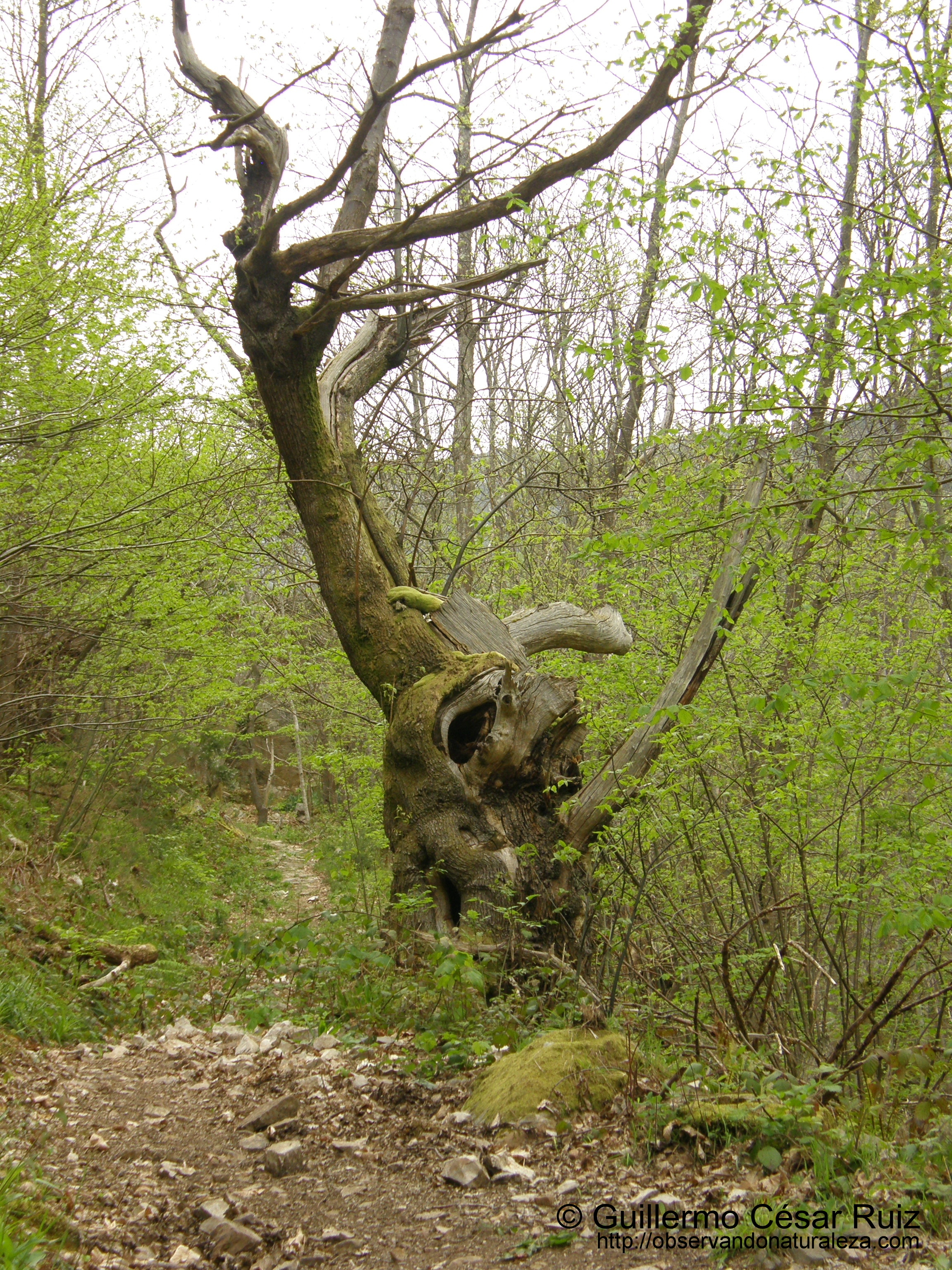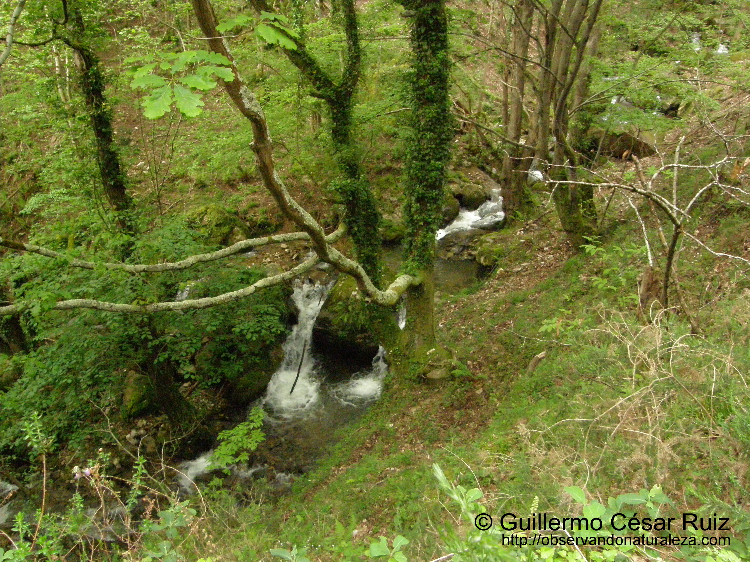 Así que tomamos el primer tramo de este camino que sale perpendicular a la mencionada senda. Y en este mismo lugar es donde el arroyo que ha horadado la Foz de Valmauru vierte sus aguas al río Teberga de forma tranquila y en silencio, como si estuviera agotado, sin fuerzas, después de los imnumerables impactos y golpes contra la piedra que hay a lo largo de la estrechura, un raullargu/rabilargo (Aegithatus caudatus) vuela libre por el Valle del Oso.