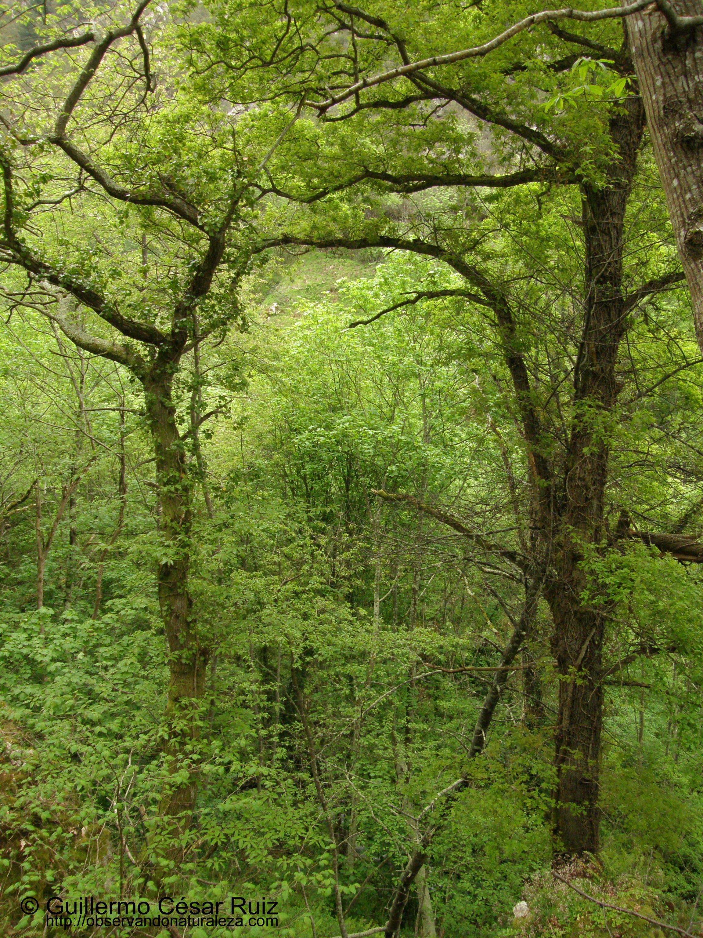 De entre el bosque que flanquea el camino y el arroyo destacan las epecies del género Quercus con la hoja del verano anterior todavía persistente, fenomeno que en botánica se conoce como “marcescencia”. Estos indivíduos pertenecientes a varias especies reciben por estos concejos el nombre genérico de polliscu, que es también, curiosamente, el nombre con el que se distinguen dos subespecies próximas como l’ardina o ancina (Quercus ilex subsp. ilex) y l’alcéu, polliscu o ancina villana (Q. ilex subsp. ballota), este último presente de forma localmente abundante en zonas de crestería por encima de la población de Banduxu, en la Sierra de Gradura.