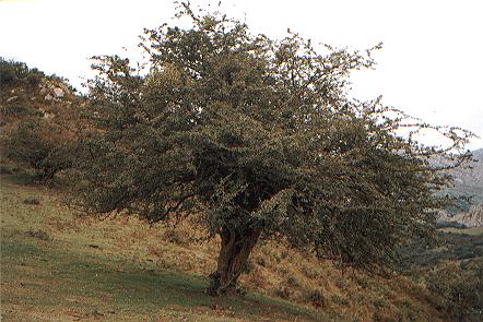 Seguimos un poco más adelante y nos topamos con una bifurcación de caminos que tomamos a la izquierda que nos lleva hasta el Mayáu la Espina o Braña Zaraméu, en este incomparable lugar a los pies de la Sierra de Sobia al abrigo de un precioso acebal y entre espineras, decidimos parar para almorzar bajo la atenta mirada de dos ferres/halcones que sobrevuelan nuestras cabezas. Desde aquí podemos contemplar Peña Collada, un «modesto» pico cuarcítico de apenas 1.103 m de alto situado a media montaña entre Proaza y Teberga. Es realmente interesante desde el punto de vista ecológico observar a lo largo de todo este recorrido que empezamos abajo junto a la «Senda del Oso» como han ido cambiando las distintas especies vegetales según íbamos ganando altitud y cambiando de orientación geográfica, como en las zonas más bajas, secas y térmicas abundan una foresta más propia de regiones mediterráneas, mientras que en las zonas húmedas y altas predomina una foresta típicamente atlántica.