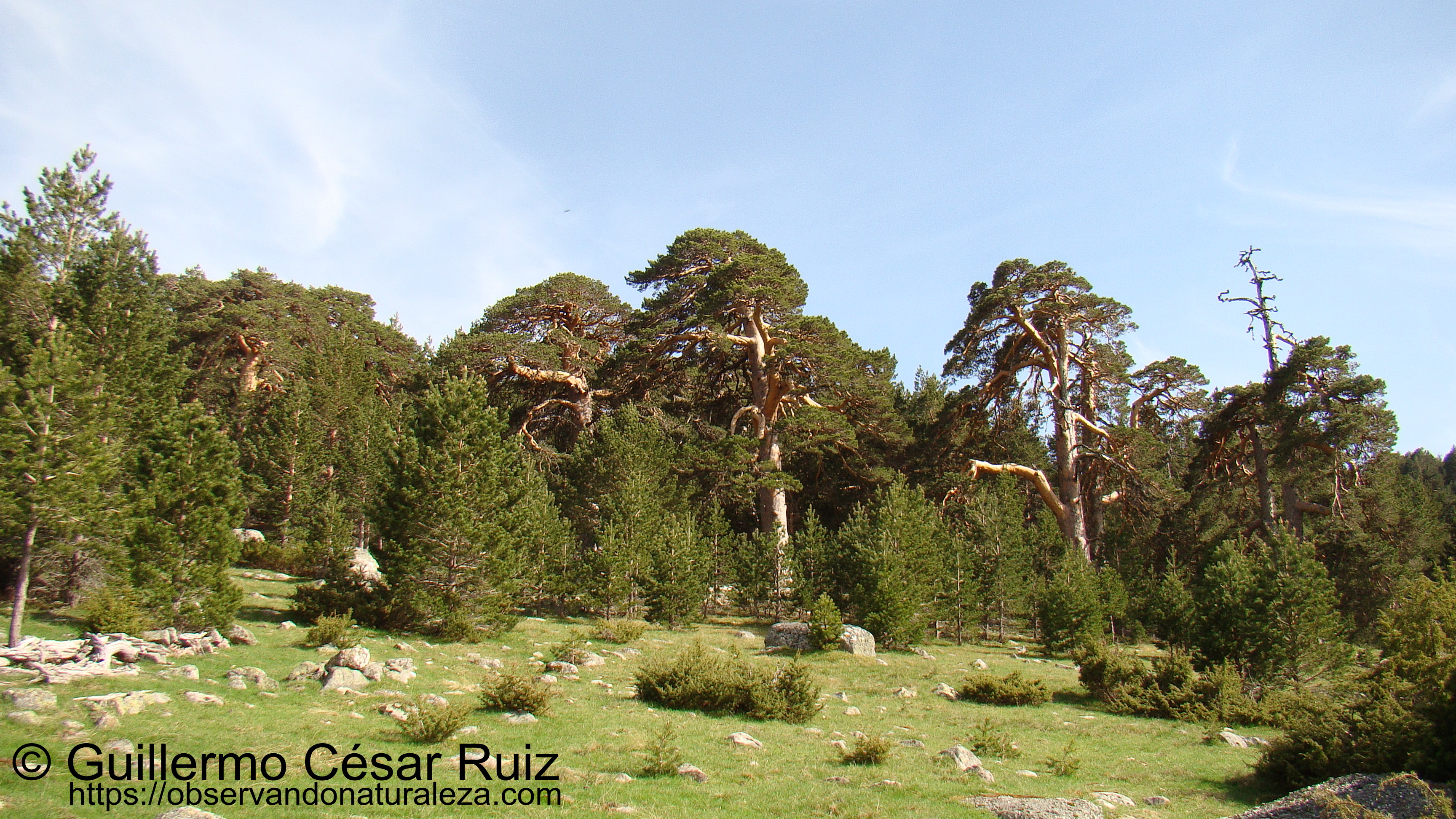 Una vez alcanzada la base de la laguna donde entroncan la senda que llevamos y la variante que comentamos junto a la Cueva de los Potros, nos dirigimos a la izquierda pasando junto al Refugio de montaña junto a la laguna, y desde allí ascenderemos, tras un breve trecho en llano por pista forestal, hasta la base de Peña Aguda, donde se encuentra el aparcamiento atravesando un extraordinario bosque de pinos albares con valiosísimos ejemplares varias veces centenarios y que no dudamos en detenernos para admirarlos.