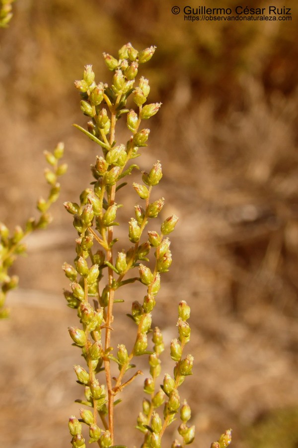 Manzanilla de pastor, Aster sedifolius, detalle punteaduras glandulosas en hojas y tallo
