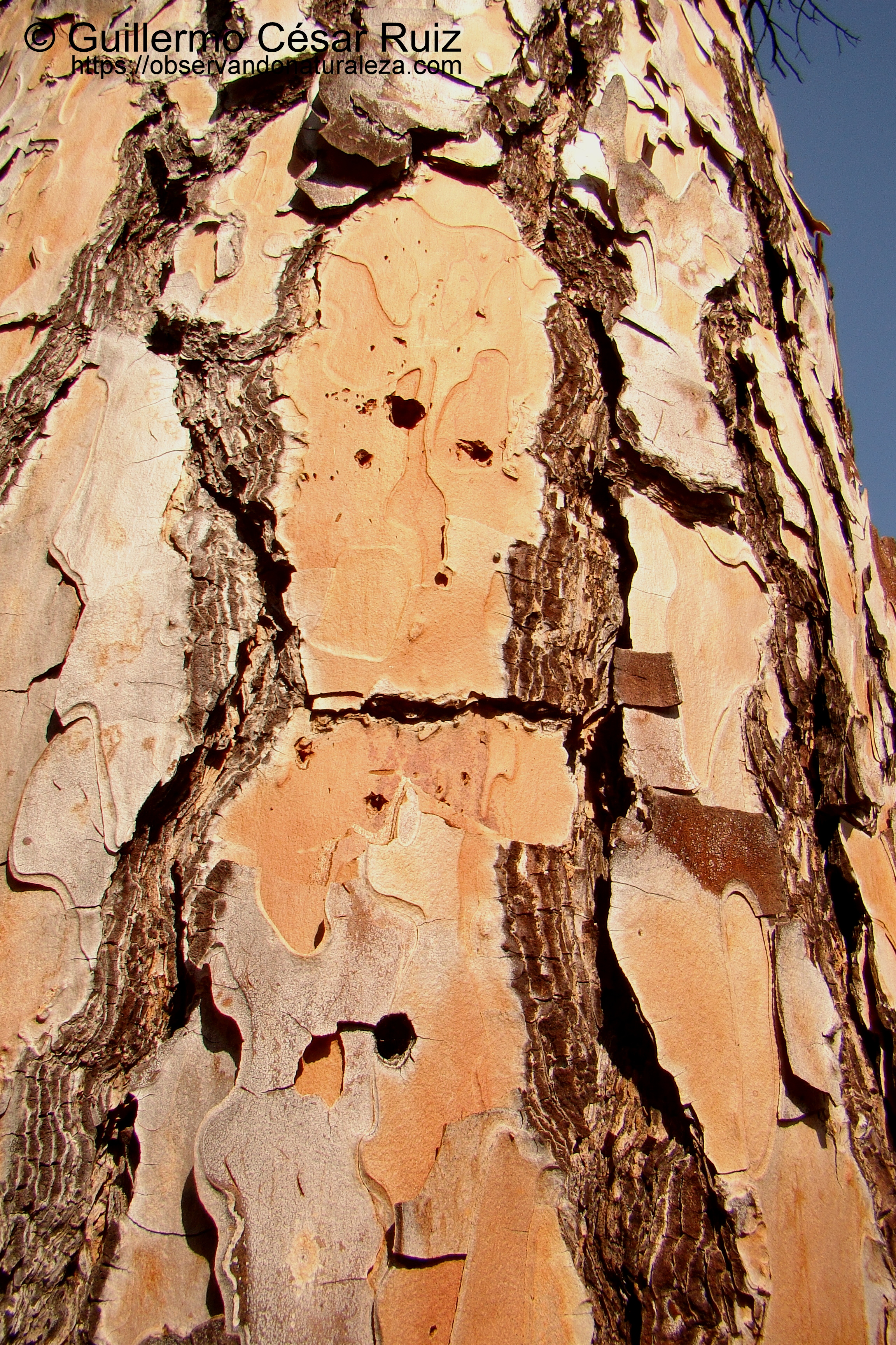 Pino piñonero, Pinus pinea, detalle corteza punteada por Dendrocopos major